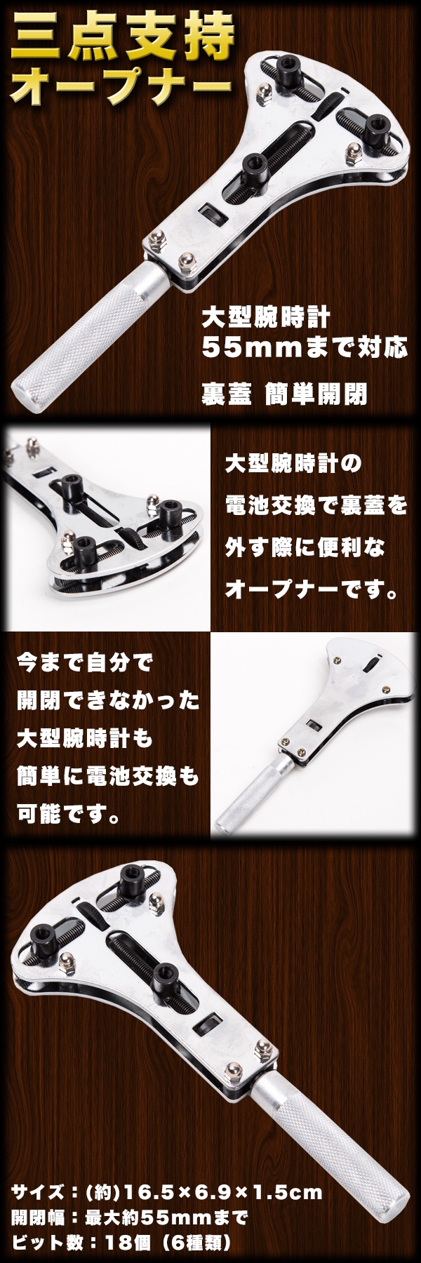 三点支持オープナー 55mm 18ビット 大型腕時計対応 裏蓋 簡単開閉 オープナー 時計工具 防水時計用 裏フタ開け器 電池交換用