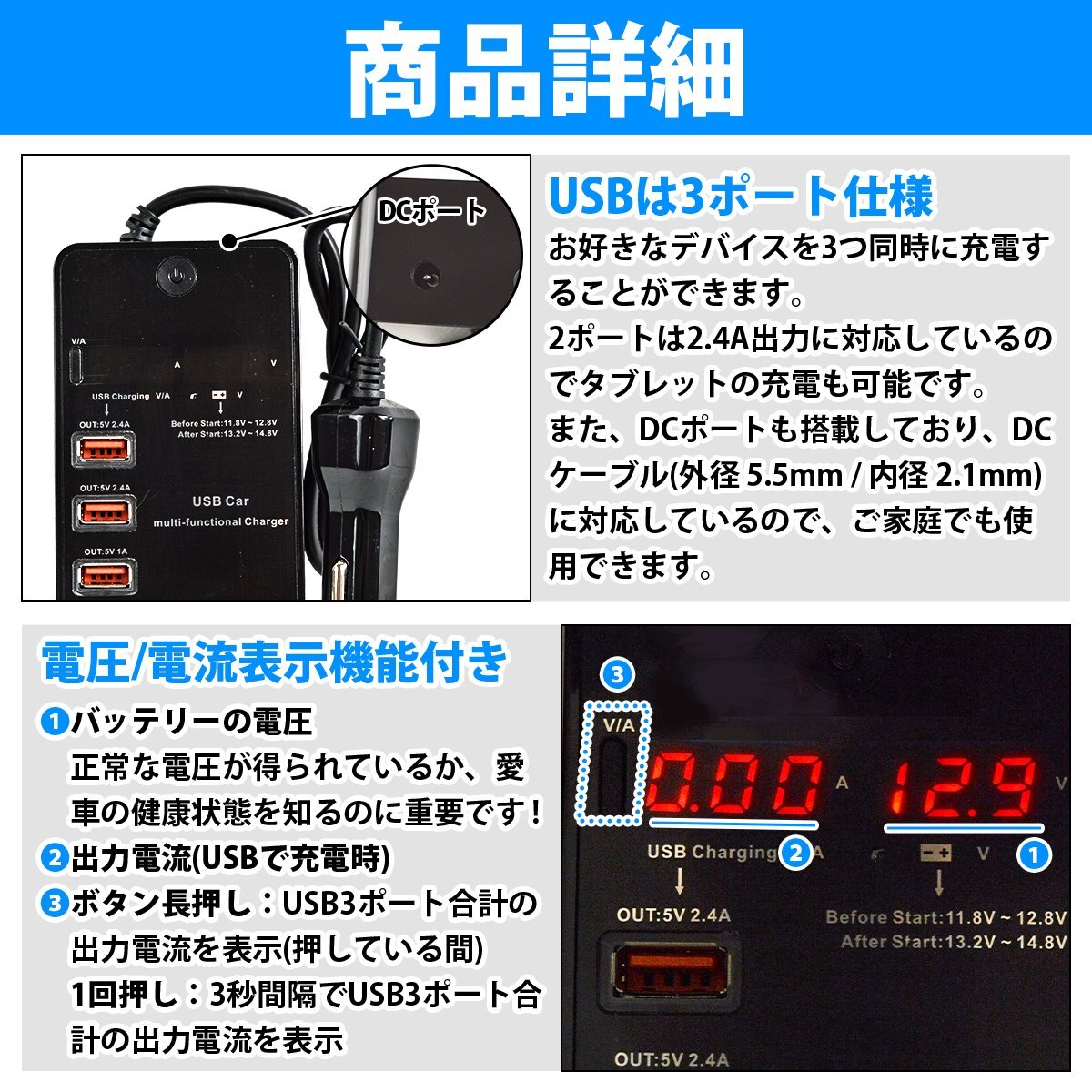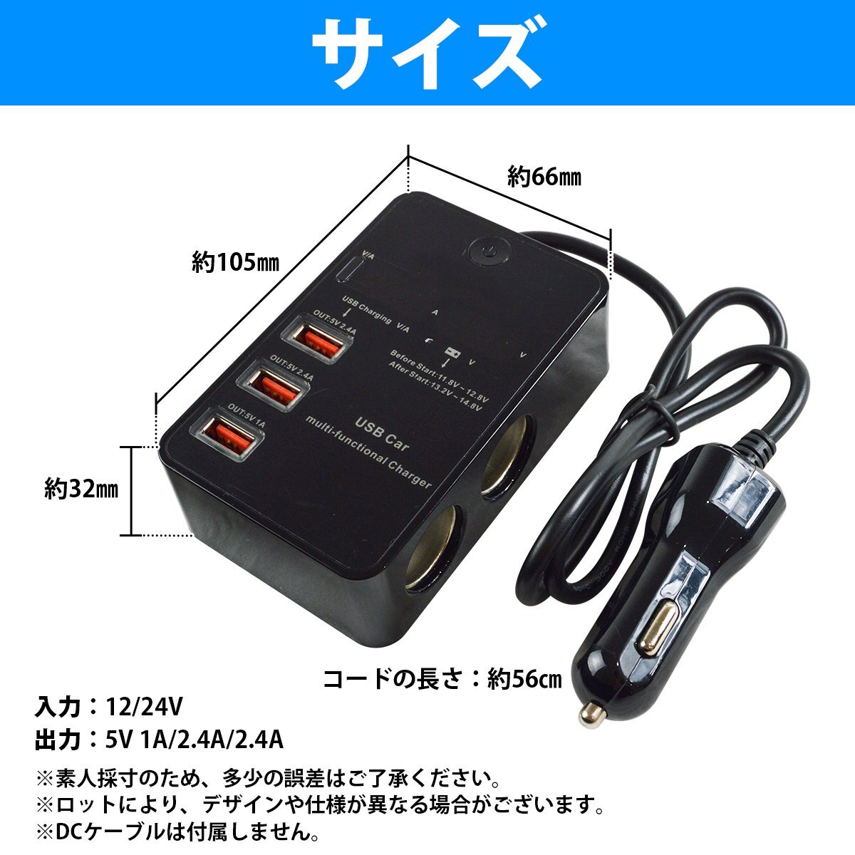【新品即納】12V/24V 120W 電流電圧表示 USB3ポート 2連 シガーソケット 5V 2.1A スマホ 充電 iPhone USBポート シガーソケット