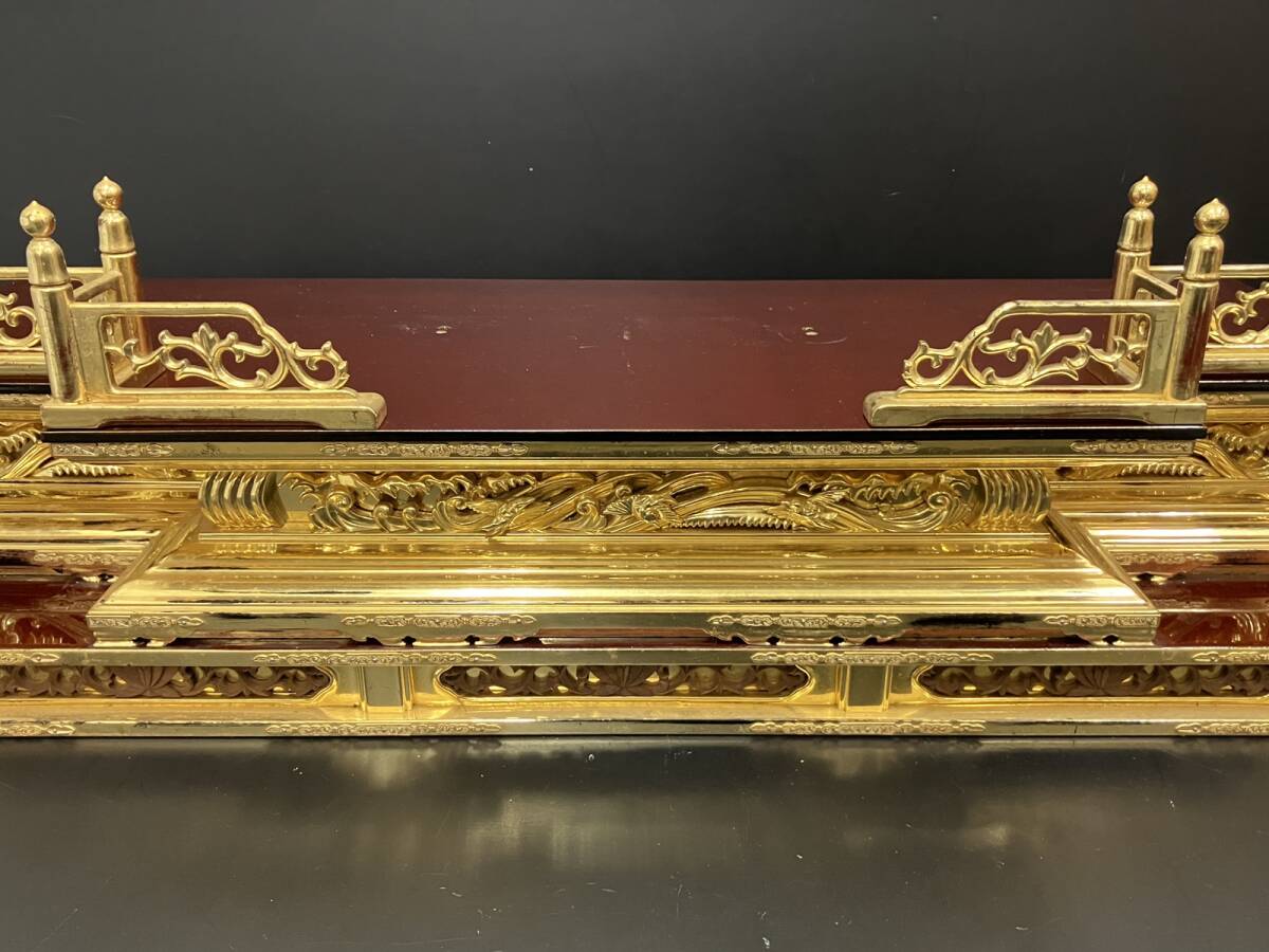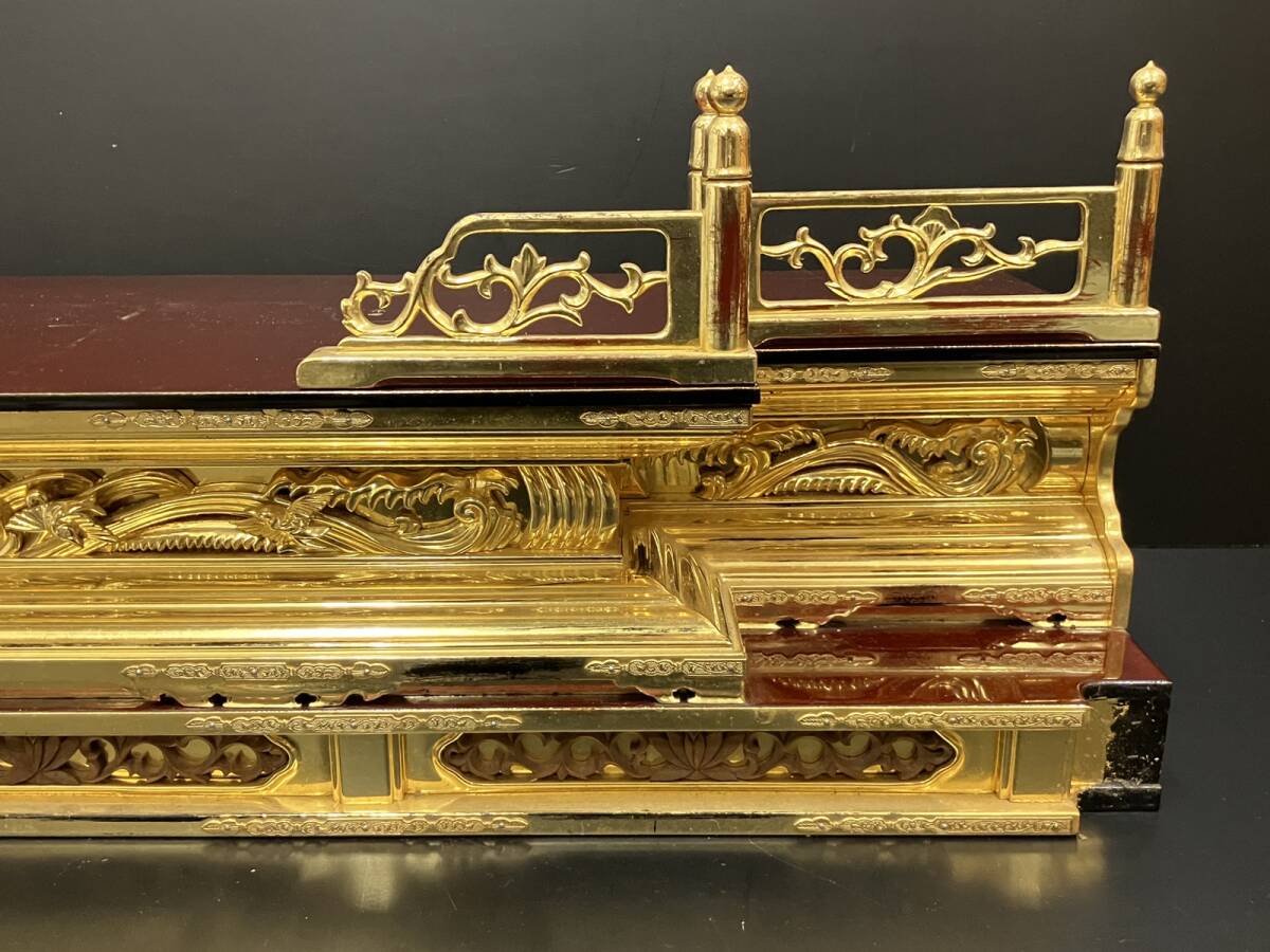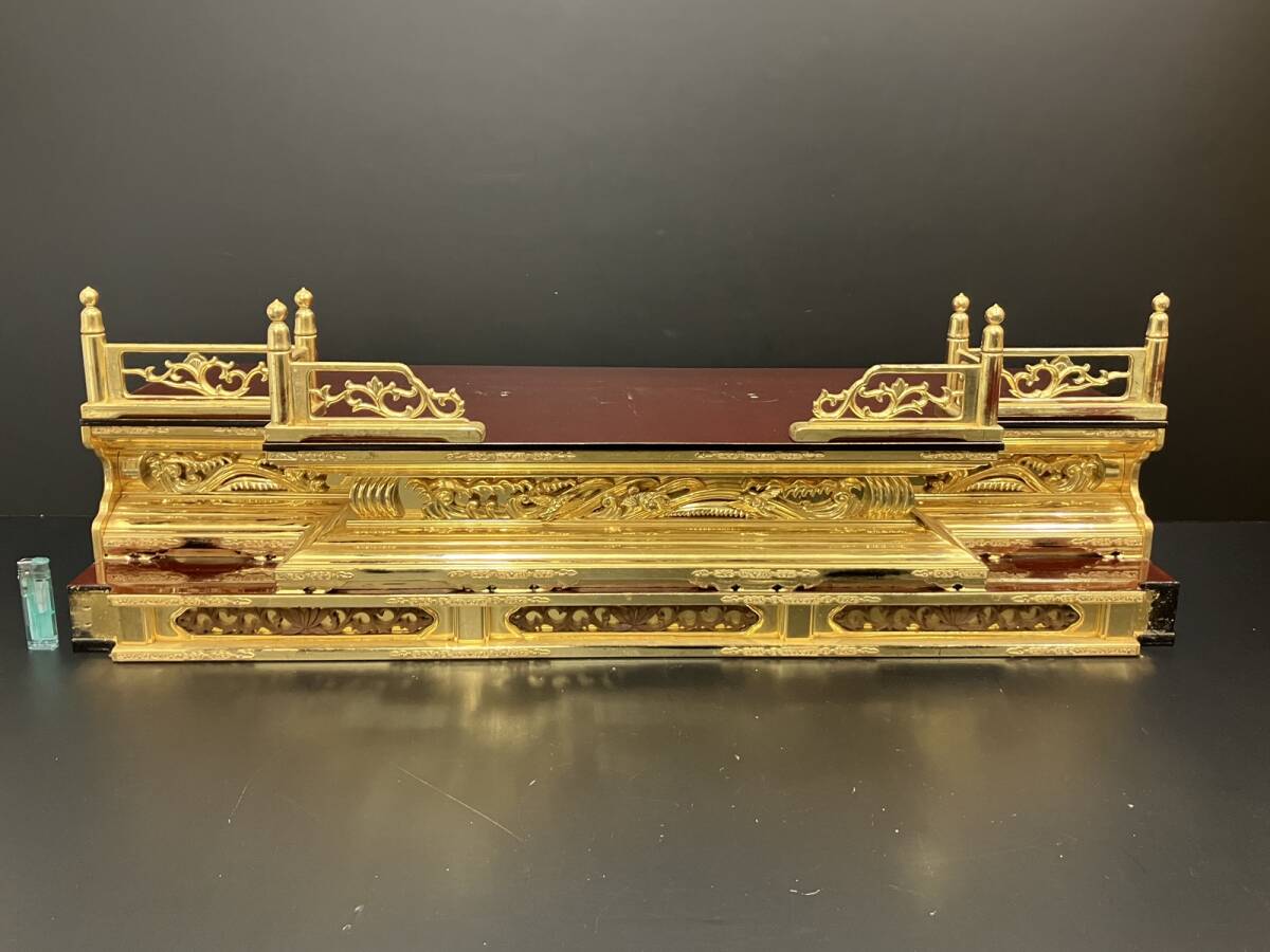 | 商品説明 | ■寸法等■ 高さ 約19.2cm(欄干含む高さ30.6cm)/横幅 約96.3cm/奥行 約36.4cm 木製・本金箔・金メッキ金具 ■状態■ ある程度の清掃はしておりますが、若干の汚れ等ございます。 大きく目立つ損傷はございませんが、須弥壇・欄干ともに金箔のスレハゲ箇所がございますので、画像にてご確認下さい。 天板部の後ろ側に重いものを乗せますと、傾きがでる可能性がございますので、支えを置くなどし、工夫してご使用下さい。 画像ではとらえられない部分がありすまが、ご理解のうえ、入札にご参加下さい。 ※入念に梱包いたしますが、古物につき運搬配送時の振動で細工等が取れてしまう可能性がございます。その場合は、ご自身にて取り付け・接着を行っていただくことをご理解願います。 | |
