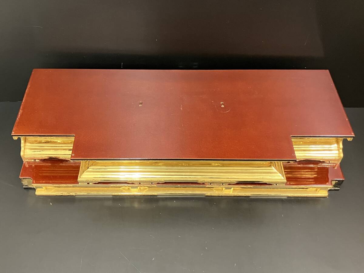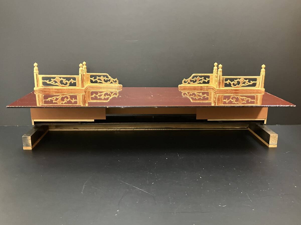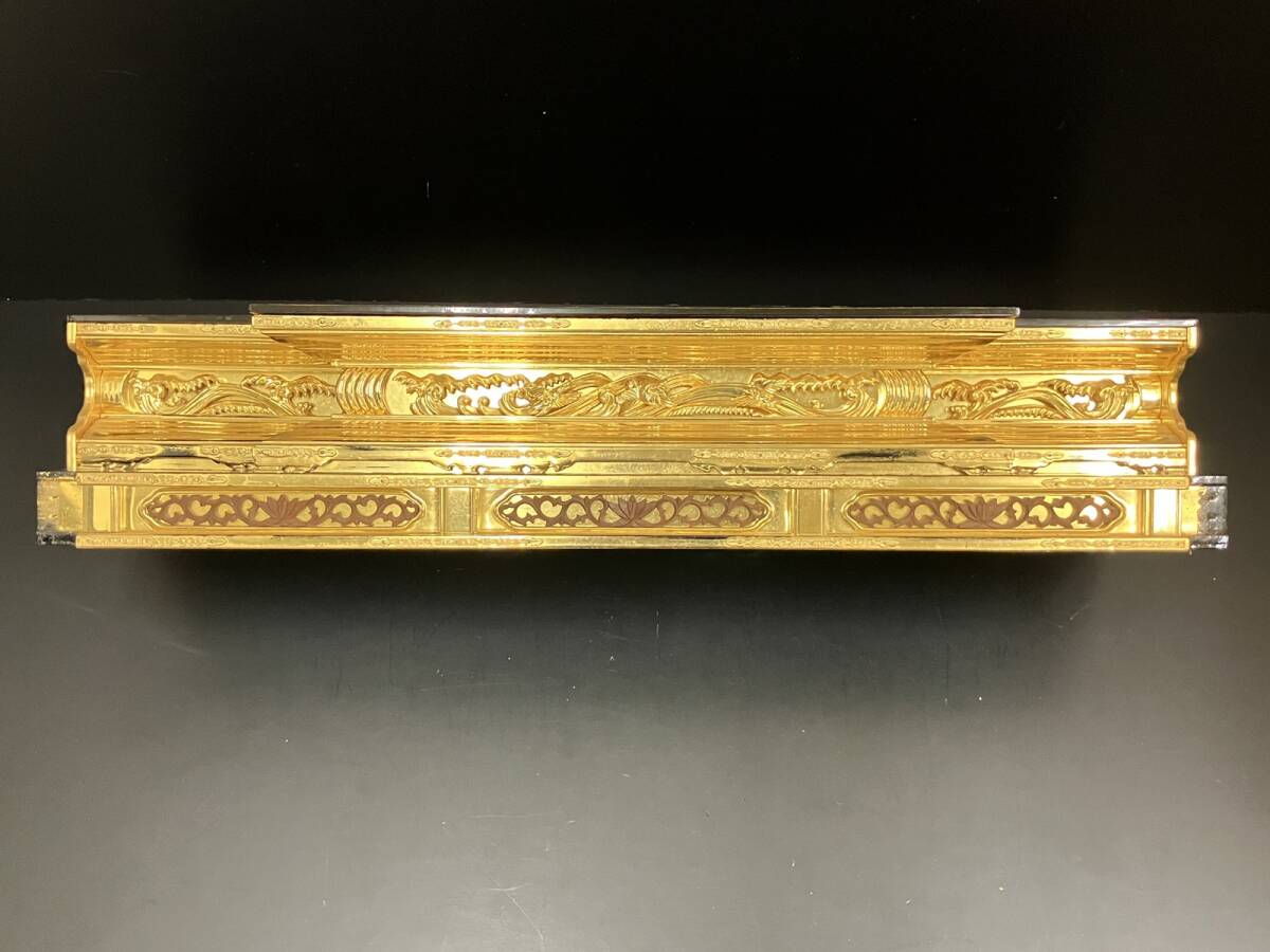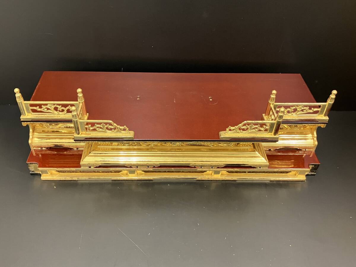| 商品説明 | ■寸法等■ 高さ 約19.2cm(欄干含む高さ30.6cm)/横幅 約96.3cm/奥行 約36.4cm 木製・本金箔・金メッキ金具 ■状態■ ある程度の清掃はしておりますが、若干の汚れ等ございます。 大きく目立つ損傷はございませんが、須弥壇・欄干ともに金箔のスレハゲ箇所がございますので、画像にてご確認下さい。 天板部の後ろ側に重いものを乗せますと、傾きがでる可能性がございますので、支えを置くなどし、工夫してご使用下さい。 画像ではとらえられない部分がありすまが、ご理解のうえ、入札にご参加下さい。 ※入念に梱包いたしますが、古物につき運搬配送時の振動で細工等が取れてしまう可能性がございます。その場合は、ご自身にて取り付け・接着を行っていただくことをご理解願います。 | |