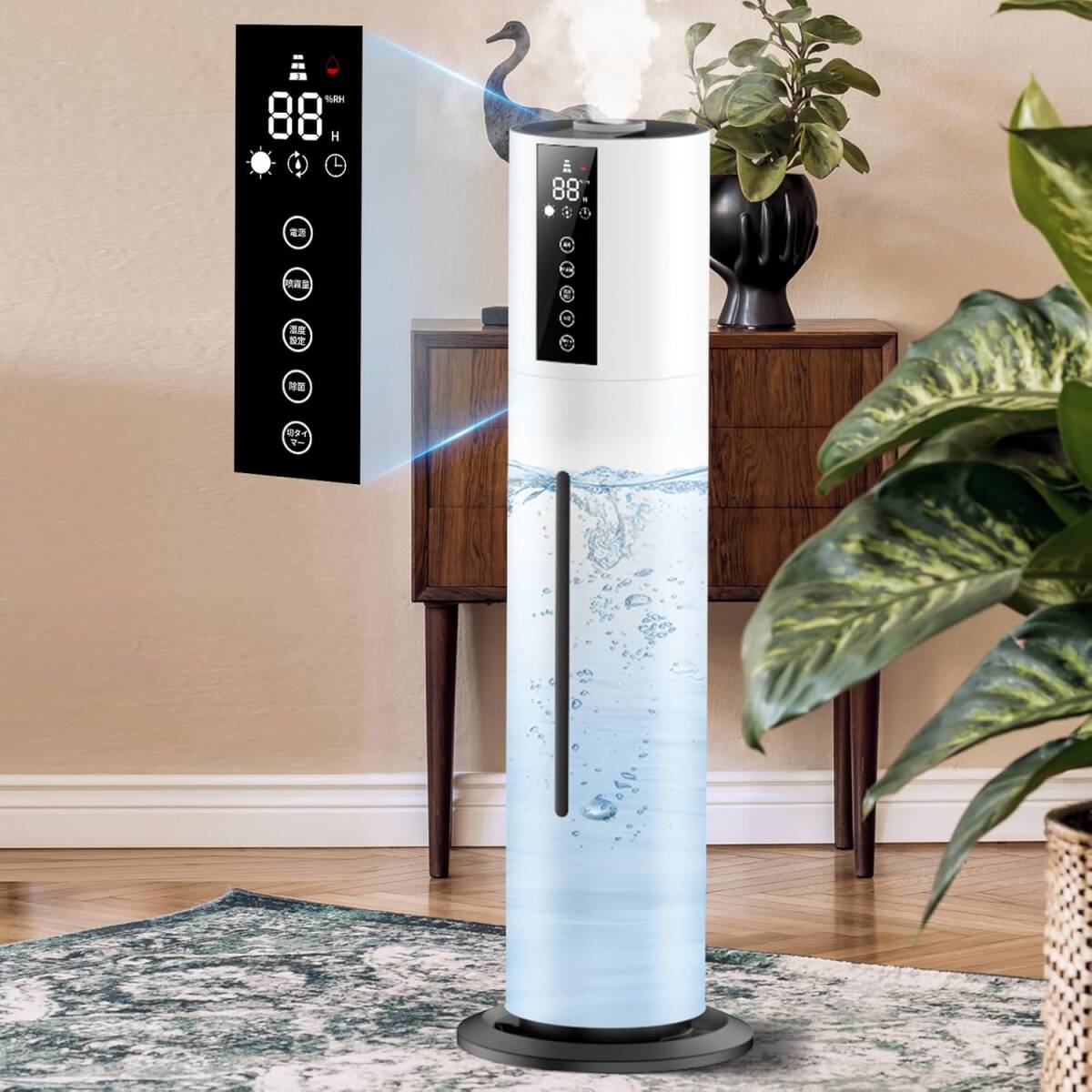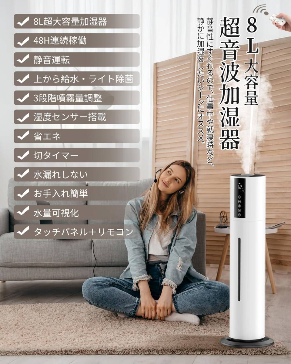 加湿器 8L 大容量 超音波式 タワー式 48時間連続加湿 アロマ対応 静音設計35dB 上部から給水 知能恒湿 360°回転