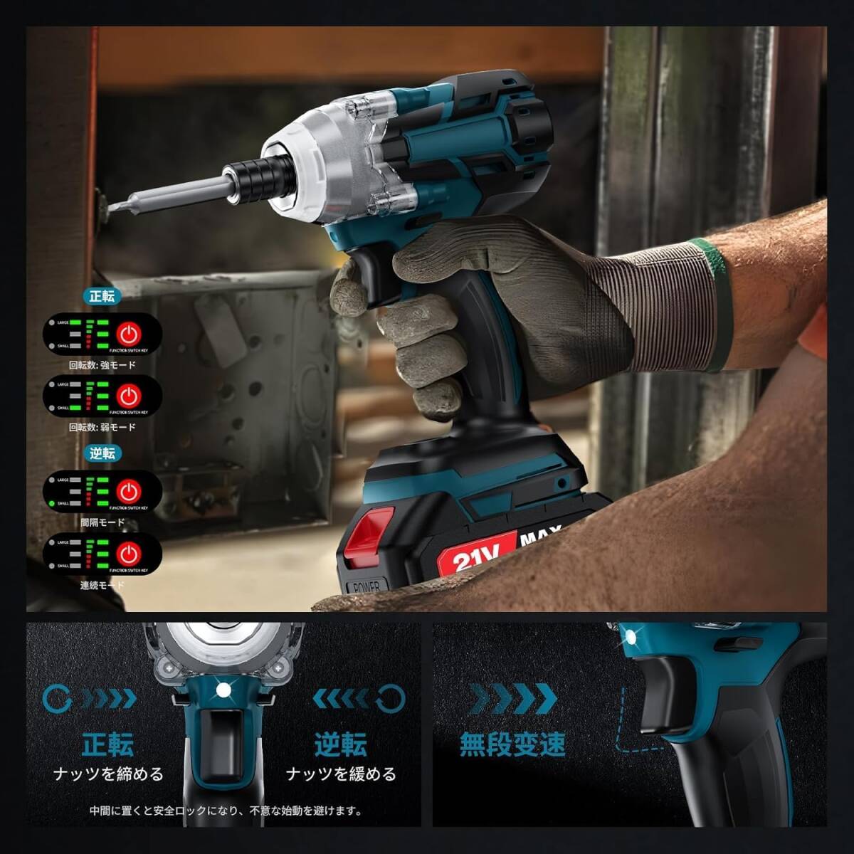 【4つの調整可能な速度モード】前進/後退レバーの位置を調整することで、インパクトソケットの回転方向を切り替えられます。ネジを緩めることも、締めることも可能です。正転:電源ボタンを押すことで高・低の出力を切り替えます。逆転:電源ボタンを押すと「small」ランプが点灯し、短時間の回転を示します。再度押すと「small」ランプが消灯し、連続回転を示します。(ご注意:使用しない時、正逆転切り替えレバーを中間の位置にしておいてください。)トリガーの引き加減で回転速度を調整でき、無段変速機能が備えています。互換性と正常な使用を確保するために、付属のオリジナルのドリルを使用することをお勧めします。他のブランドや型番のドリルを使用する場合は、機器と互換性のあるドリルに交換する必要があるかもしれません。