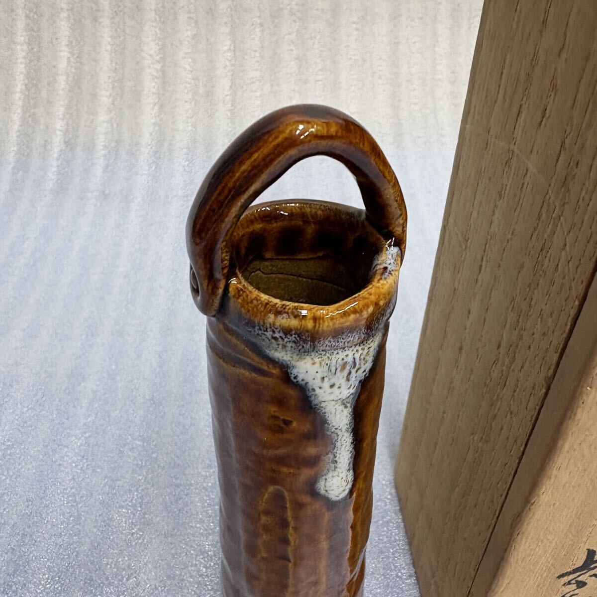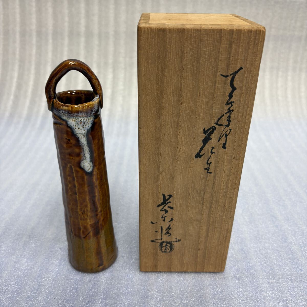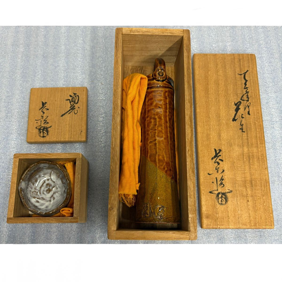 ◆大樋焼 大樋長楽作 2点まとめてセット 手桶型花入 ぐい 酒器 共箱 飴釉 手捻花生 花瓶 花器 茶道具 一輪挿し 盃