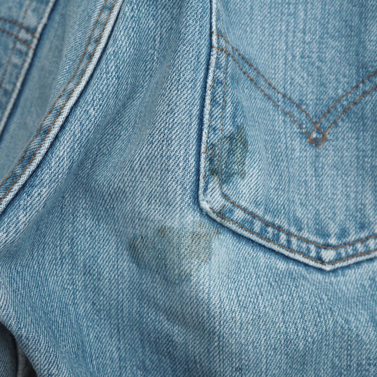 【コンディション詳細】 所々にアタリ、薄汚れや小汚れ、薄いシミ、ラベル、左ベルトループ、裾に破け、写真のようにヒップ部分に2箇所シミがございますものの、ほか支障になるようなダメージなどはございません。 |