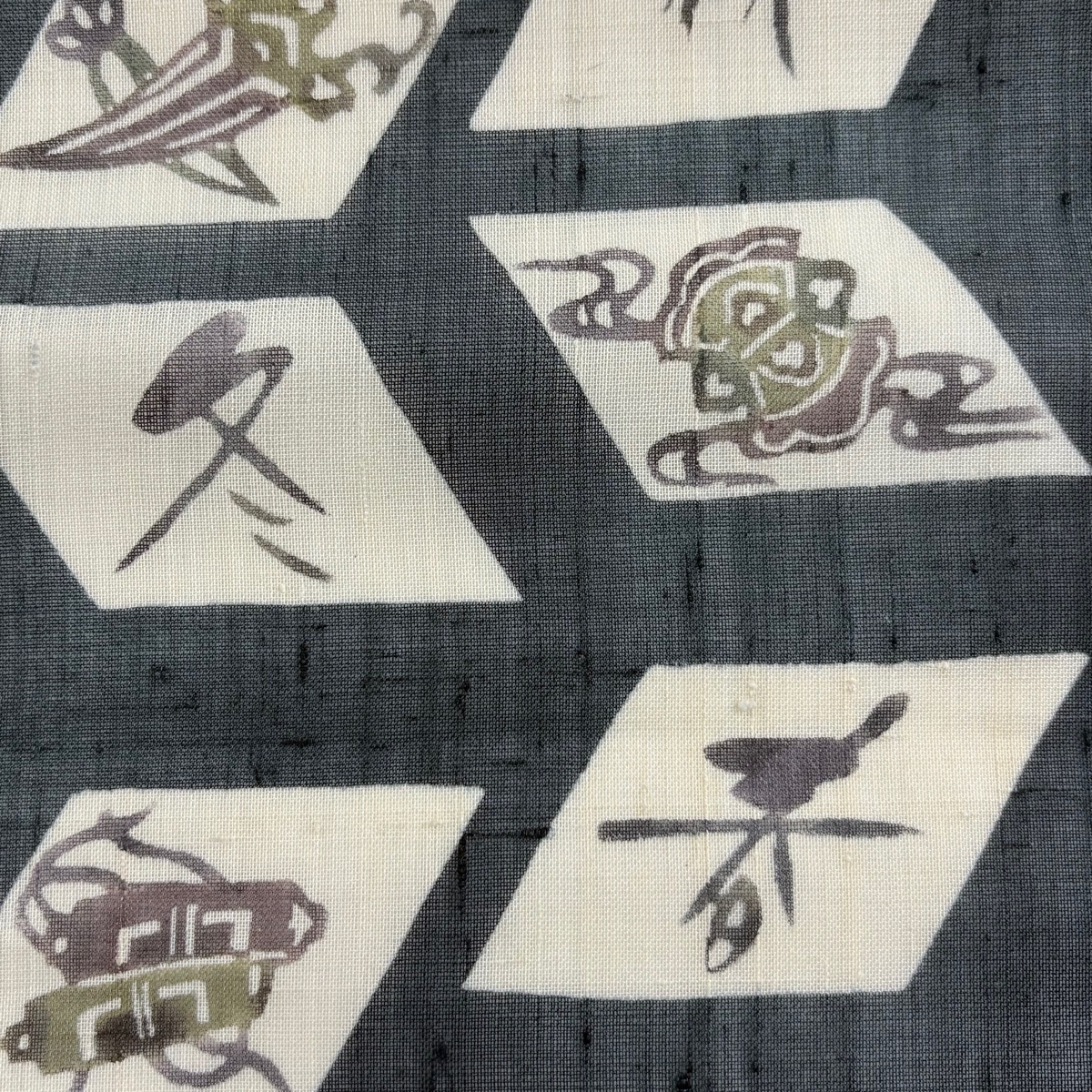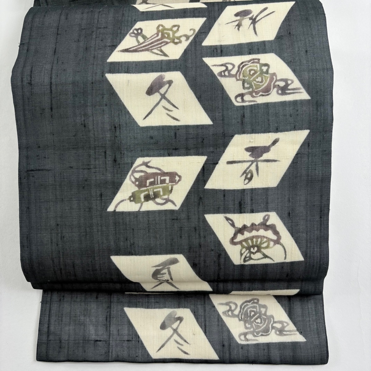 | 開き名古屋帯 秀品 夏帯 宝尽くし 春夏秋冬 深緑 正絹 【中古】 |