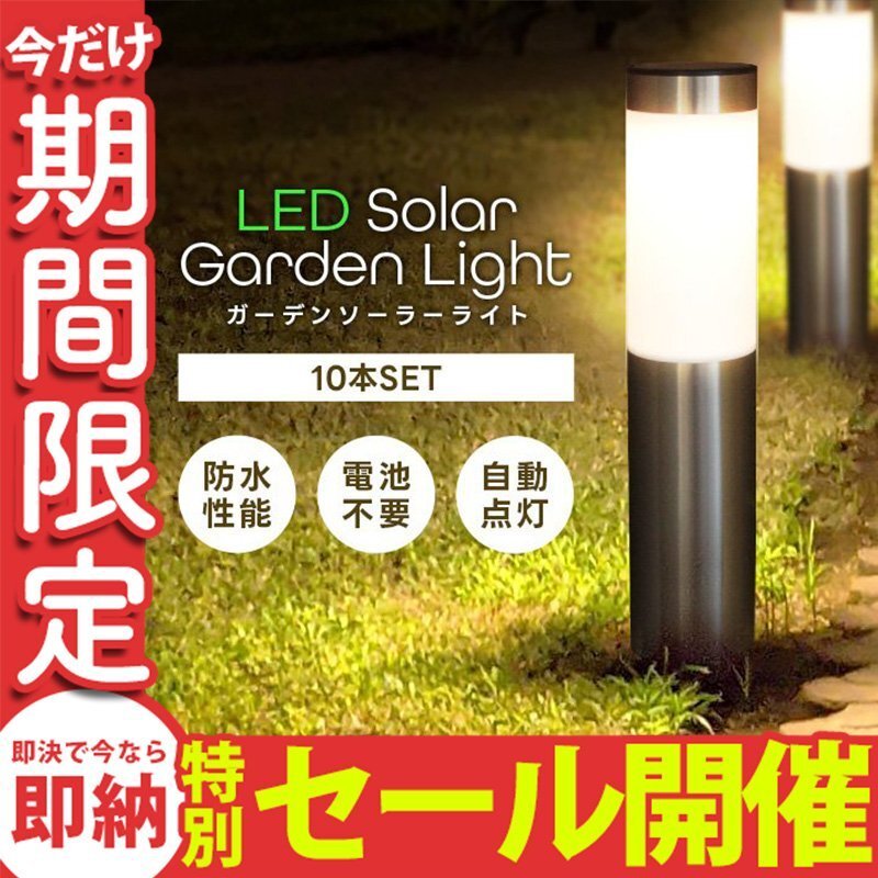 | 地面に埋め込むだけで設置でき、ソーラー発電で電気代不要! お庭や玄関先などに最適なLEDソーラーライトです。 地面に差すだけとセッティングもカンタン。 暗くなったら自動点灯、明るくなったら自動消灯。 ソーラーパネルが日中太陽の光で充電し、夕暮れになると自動的に点灯します。 お手軽カンタンに、自宅のお庭を彩ります。 付属品のアンカーを地中に埋め込んで固定し、玄関までの通路や庭先までのアプローチ部分にやさしい明かりを灯して下さい。 ●詳細 サイズ ・直径:(約)8cm ・ソーラーライト本体:(約)40cm ・全高:(約)56cm 重量:(約)450g 発光色:電球色 光源:LED 電池:電池:ニッケル水素電池1本 1200mAh 点灯時間:(約)6~8時間 ※直射日光が6時間以上あたる場所に設置した場合。 素材:プラスチック、ステンレス ●セット内容 ・本体 ×10 ・ソーラーパネルライト ×10 ・アンカー ×10 (ガーデンライト ソーラー おしゃれ ソーラーガーデンライト ソーラーライト ガーデン 防犯 車 照明 外灯 LED照明 LED 庭園灯 スポットライト 門灯 自動点灯 ソーラーLED 庭 ガーデニング プレゼント 安い 人気 おすすめ ) |