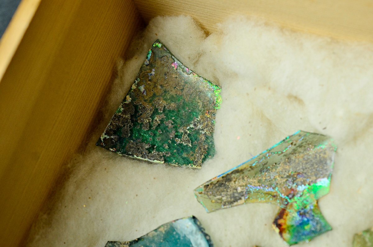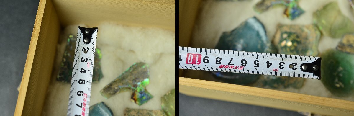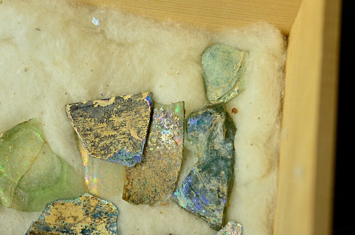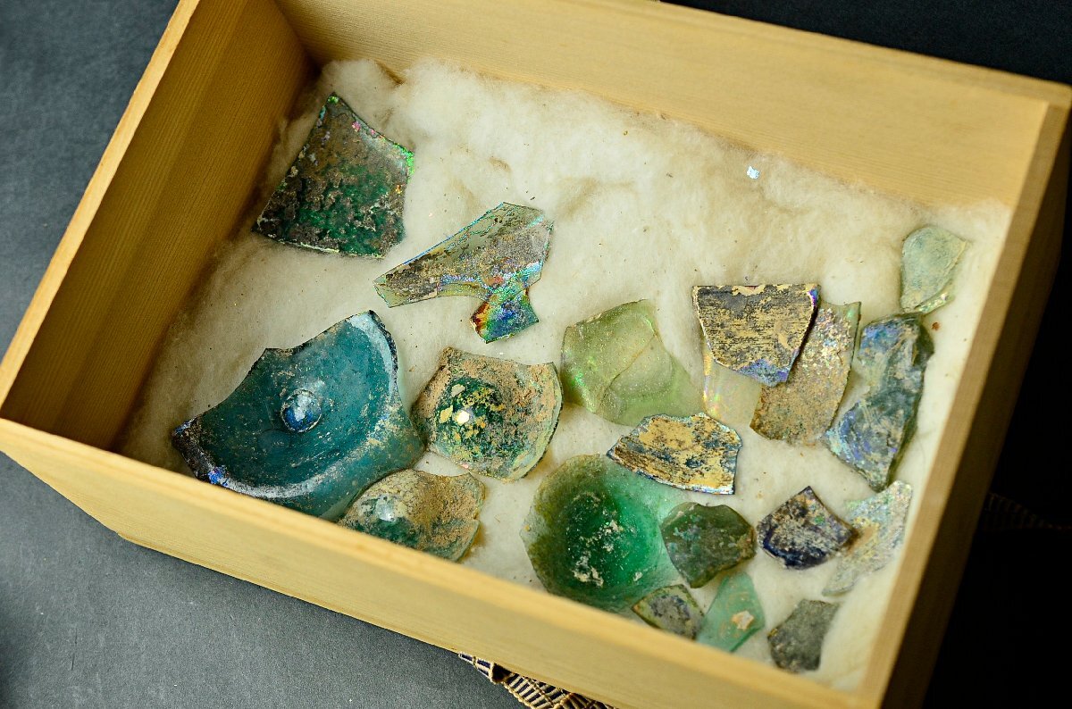 古代ローマンガラス銀化陶片まとめ ・東地中海シリア・アフガニスタン出土・3-4世紀頃・桐箱付属 ◆瑠璃硝子トンボ玉25Y1130-8