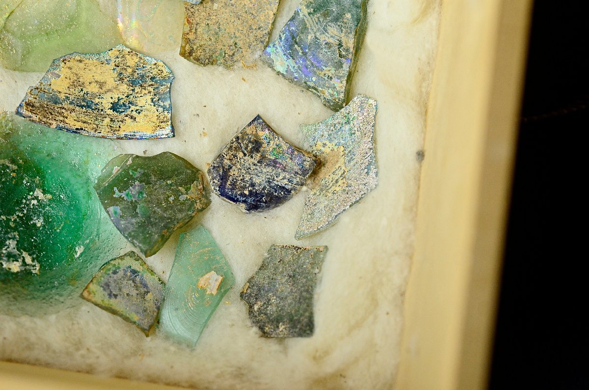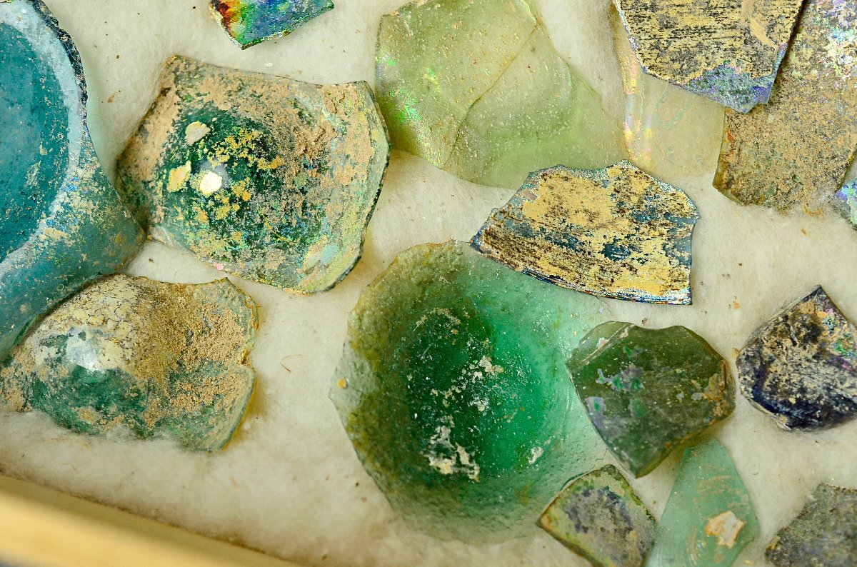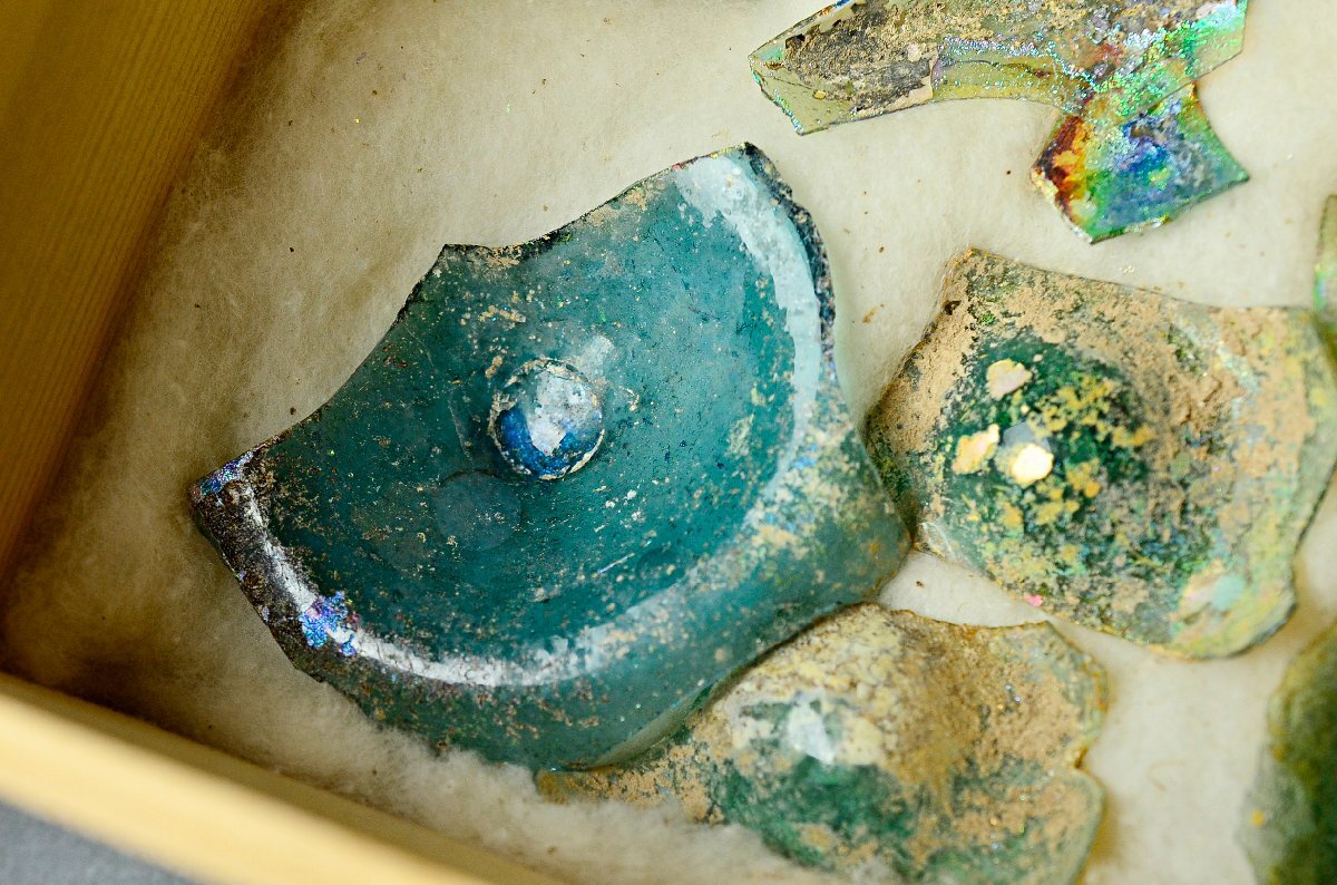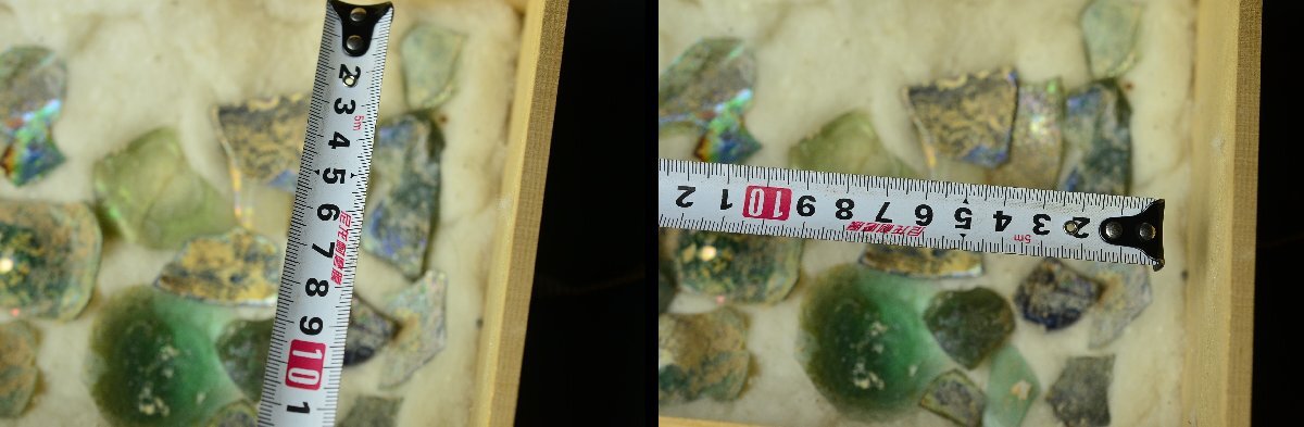 古代ローマンガラス銀化陶片まとめ ・東地中海シリア・アフガニスタン出土・3-4世紀頃・桐箱付属 ◆瑠璃硝子トンボ玉25Y1130-8