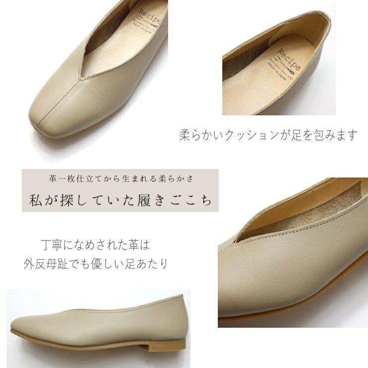 | Vカットのトップラインが脚を美しく見せ、ヒール無しでも上品な印象に。 深めの履き口の為、親指小指の付け根も柔らかく包み込みます。 外反母趾傾向が気になる方にもオススメのデザインです。 さっと履けて脱げにくく、つい毎日選びたくなる1足です。 ●ビジネスやフォーマルにも使えるきちんと感。 ●快適な履きこごちとキレイ見えを両立。 ●柔らかい足あたりのソフトレザーを使用、履くごとに足に馴染みます。 ●甲深で足をしっかりと包み込みます。外反母趾傾向が気になる方にも。 ●手を使わずさっと履けて、脱げにくい。 ●肌寒い時期は靴下を合わせてカジュアルなコーディネートもお楽しみ頂けます。 ※こちらは革製品の為、性質上新品であっても多少のシワや細かなキズなどがある場合がございます。 恐れ入りますがご理解、ご了承のほどよろしくお願い申し上げます。 Recipe(レシピ)の靴は、足のこと、歩行のことを大事に考えて設計されています。 全ての材料を日本国内で調達・加工。 65年以上の靴づくりの中で得た知識をRecipeの中に惜しみなく盛り込み、優しい履きごこちを貴女にお届けします。 | |