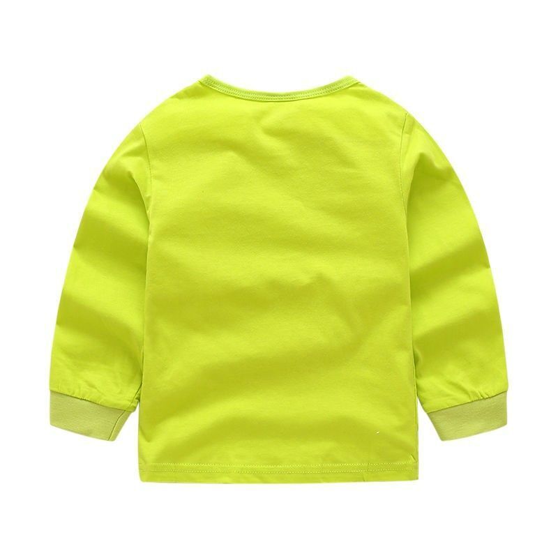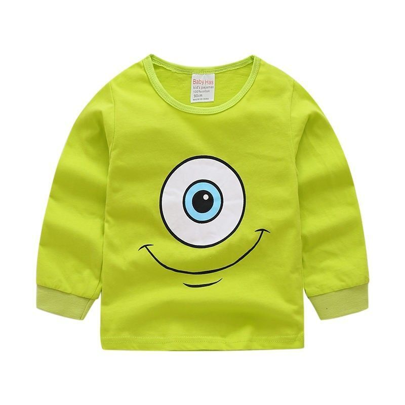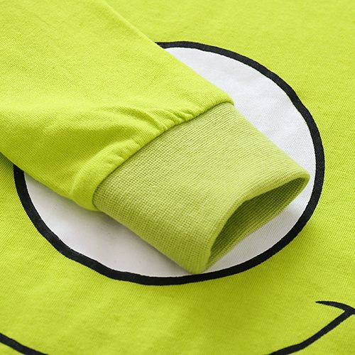- 鮮やかなライムグリーンの長袖トップスには大きな目玉とスマイルがプリントされ、お子様に大人気のキャラクター風デザインとなっています。