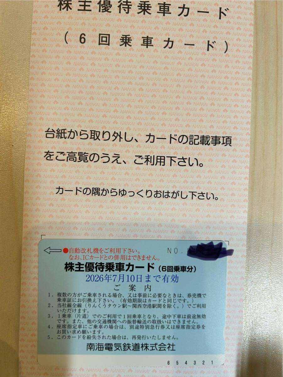 南海電気鉄道(南海電鉄) 株主優待乗車カード(6回乗車分)(有効期限: 2026年7月10日)