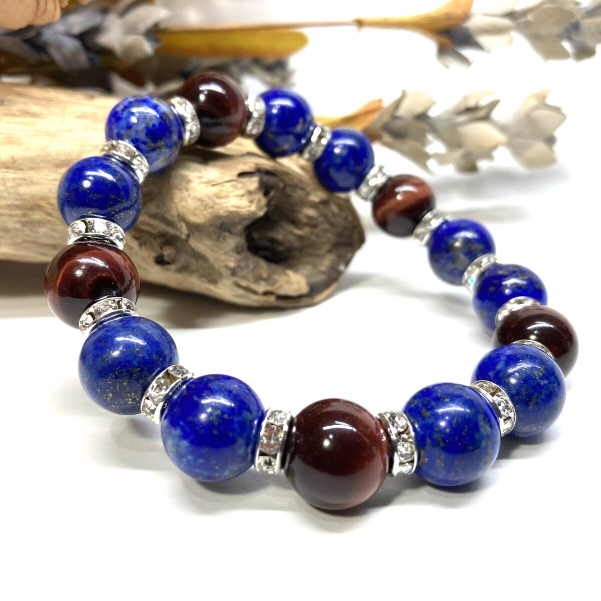 こちらは、ラピスラズリとレッドタイガーアイを組み合わせたパワーストーンブレスレットです。間にはロンデルを挟み高級感あるデザインに仕上げております。程よくインパクトがある12mm玉を使用して内周約18cmです。(サイズ変更の場合は取引ナビにてご連絡をお願いします。) 数に限りがございますので気になる方はお早めにどうぞ。