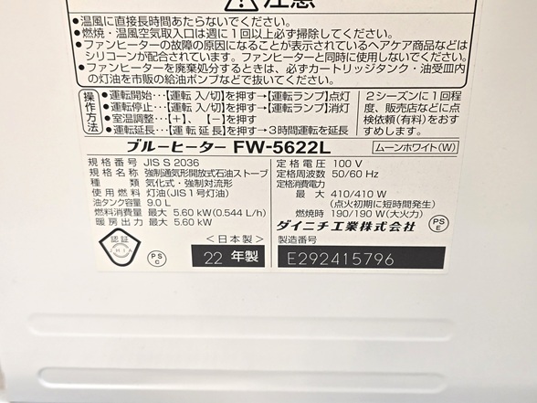 【中古品】 ダイニチ Dainichi 石油ファンヒーター 木造~15畳 鉄筋~20畳 タンク容量9L FW-5622L 2022年製 ムーンホワイト ○YR-19594○ の出品です。