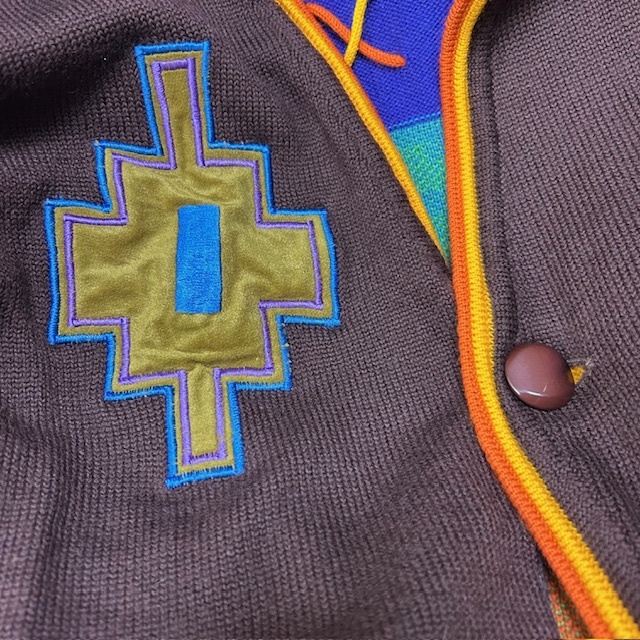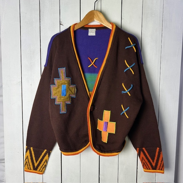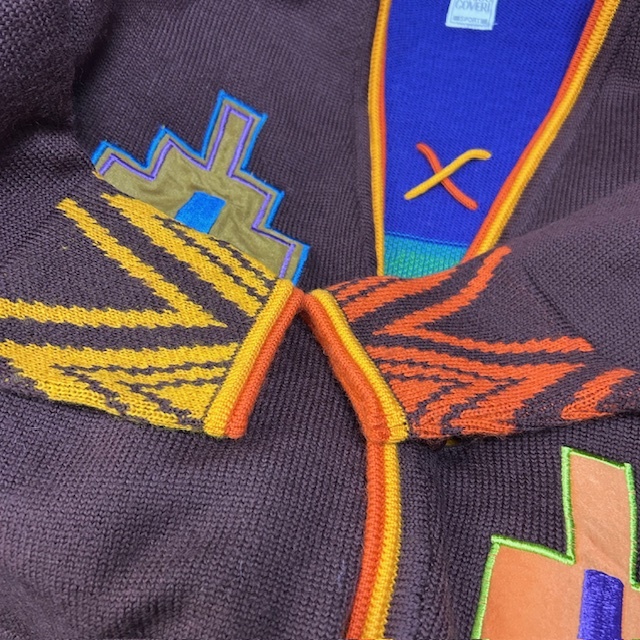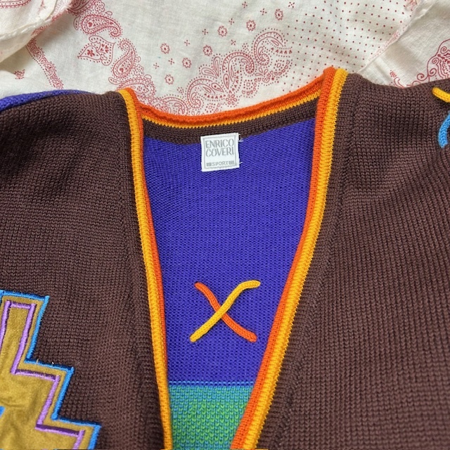 ●商品説明・・・80年代~90年代頃と思われるオールド・ヴィンテージののエンリココベリの可愛い装飾・カラフルなジャガード編みのショート丈(短丈)のニットカーディガンというかニットジャケットのような感じの一着です。素材は本体ウール100%で、ミドルゲージ程度の柔らかなニット生地で、色はベースは焦げ茶(ダークブラウン)です。