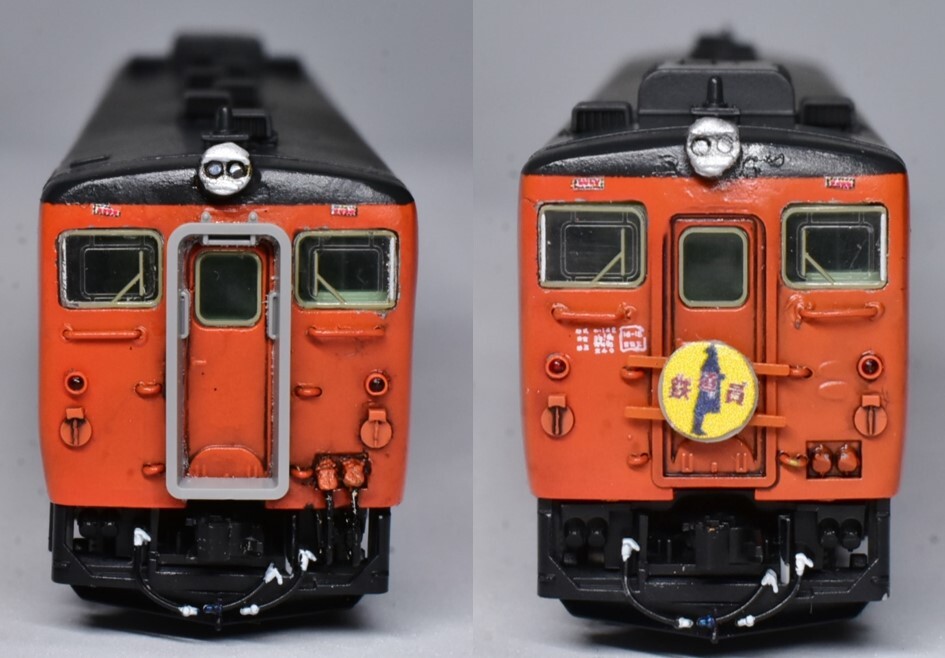 ・平窓上部には架線注意インレタ、貫通扉には3Dパーツのヘッドマーク台座と「鉄道員」ヘッドマークを取り付けています。台座は両面テー