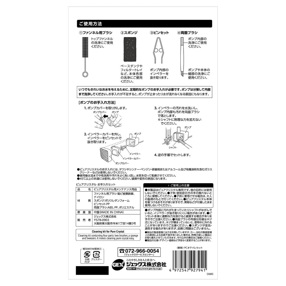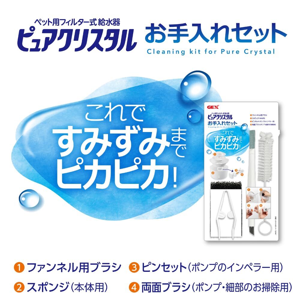 商品紹介 ピュアクリスタルをお手入れしやすい4点セット。すみずみまでピカピカに! ●このお手入れセットですみずみまでピカピカ! ●ピュアクリスタル専用のお手入れ4点セット:ファンネル用ブラシ(トップファンネルの洗浄にご使用ください)、スポンジ(ベースタンクやフィルタートレイなど、本体各部の洗浄にご使用ください)、ピンセット(ポンプ内部のインペラーを抜き取ります)、両面ブラシ(ポンプ内部の洗浄やポンプや本体の細部の洗浄にご使用ください) 【月に1回しっかりお手入れ】いつでもきれいなお水を与えるために、定期的なポンプのお手入れが必要です。ポンプは分解して内部まで洗浄してください。お手入れが不足すると、ポンプが止まったり水が流れなくなる原因にもなります。 【ポンプのお手入れ方法】1.ポンプカバーを取り外します。 2.インペラーカバーを外し、インペラーをピンセットで抜き取ります。 3.インペラーの汚れを水洗いし、ポンプ内部も汚れを両面ブラシで落とします。※シャフトに無理な力を加えないでください。 4.逆の手順でセットします。 セット内容:ファンネル用ブラシ、ピンセット、スポンジ、両面ブラシ 使用方法 ●ファンネル用ブラシ:トップファンネルの洗浄にご使用ください。●スポンジ:ベースタンクやフィルタートレイなど、本体各部の洗浄にご使用ください。●ピンセット:ポンプ内部のインペラーを抜き取ります。●両面ブラシ:ポンプ内部の洗浄にご使用ください。ポンプや本体の細部の洗浄にご使用ください。 ●いつでもきれいなお水を与えるために、定期的なポンプのお手入れが必要です。ポンプは分解して内部まで洗浄してください。お手入れが不足すると、ポンプが止まったり水が流れなくなる原因にもなります。 【ポンプのお手入れ方法】1.ポンプカバーを取り外します。 2.インペラーカバーを外し、インペラーをピンセットで抜き取ります。 3.インペラーの汚れを水洗いし、ポンプ内部も汚れを両面ブラシで落とします。※シャフトに無理な力を加えないでください。 4.逆の手順でセットします。 ●ピュアクリスタルのお手入れには、タワシやシンナー・ベンジン・研磨剤またはアルコール及び有機溶剤を含むガラスクリーナーなどは使用しないでください。●使用後は流水で中性洗剤や汚れをよく洗い流し、水気を切って乾燥させてください。●45℃以上のお湯には使用しないでください。破損や変形の原因になります。 ※本製品はピュアクリスタル専用です。他の目的には使用しないでください。※ポンプ内部に汚れがたまっていたりシャフトがゆがんでいると、インペラーが抜き取りにくい場合があります。※ピンセット本体に過剰な力を掛けると破損する場合がありますのでご注意ください。※両面ブラシの布部分先端はネジ式になっています。ネジが締まっていないと、使用中に外れることがありますのでご注意ください。※スポンジが変色・退色する場合がありますが、品質に問題はございません。 ●本品はピュアクリスタル用です。他の目的には使用しないでください。●定期的にポンプは分解し内部まで洗浄して下さい。●タワシやシンナー・ベンジン・研磨剤またはアルコール及び有機溶剤を含むガラスクリーナーなどは使用しないで下さい。●45度以上のお湯には使用しないで下さい。