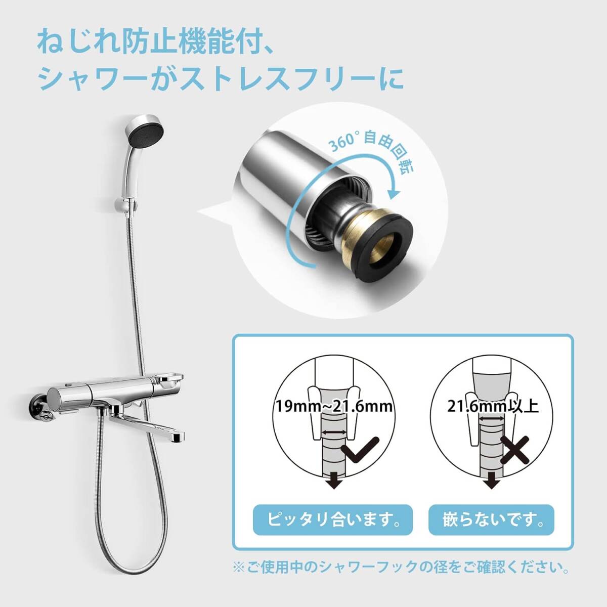 • [ねじれ防止機能付き] シャワーヘッドの接続部は360°自由回転できるため、使用中の絡み合いを防ぐことができます。シャワーヘッドの角度を合わせなくてもお好みの位置でシャワーを楽しめます。