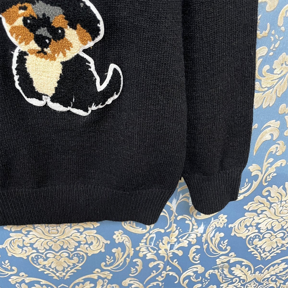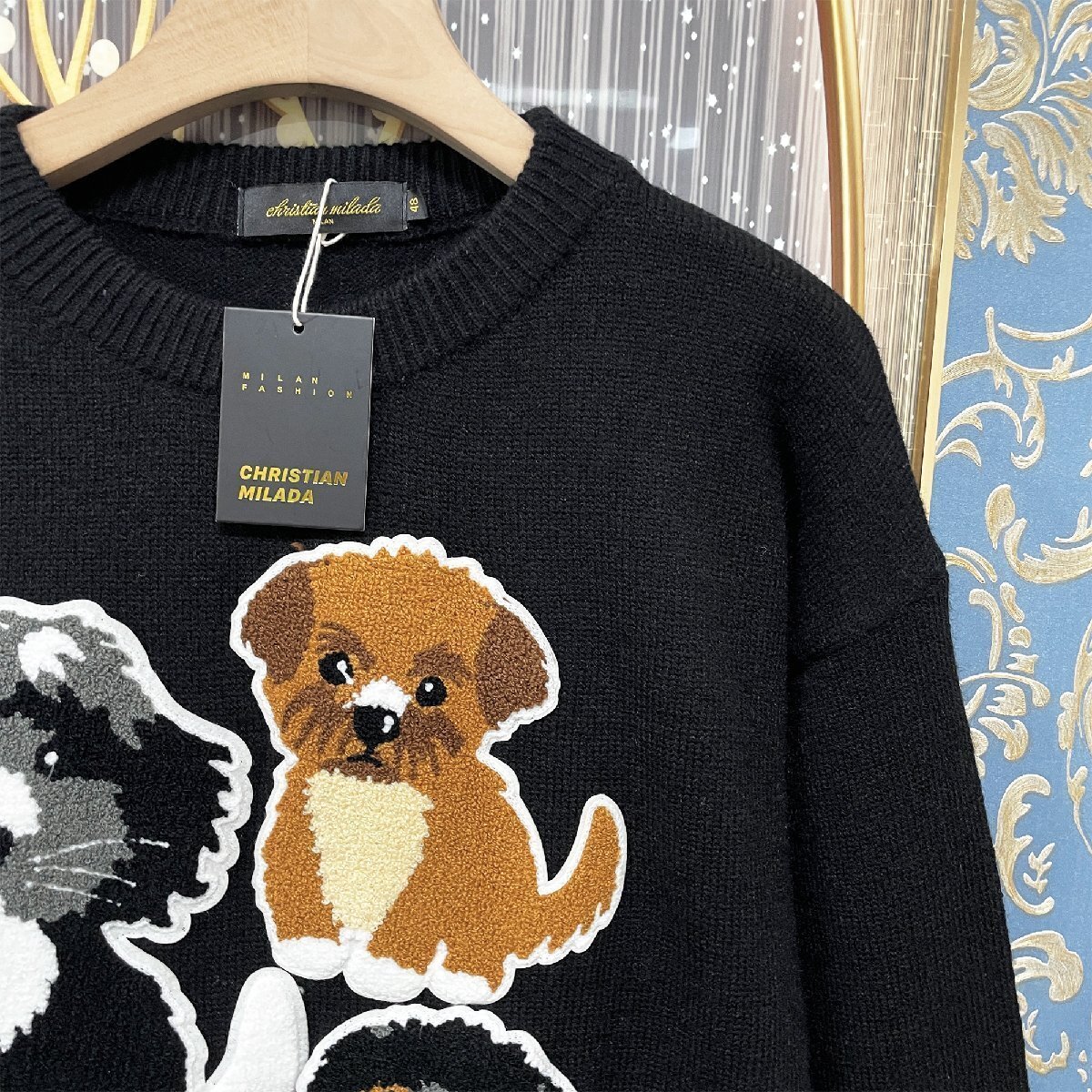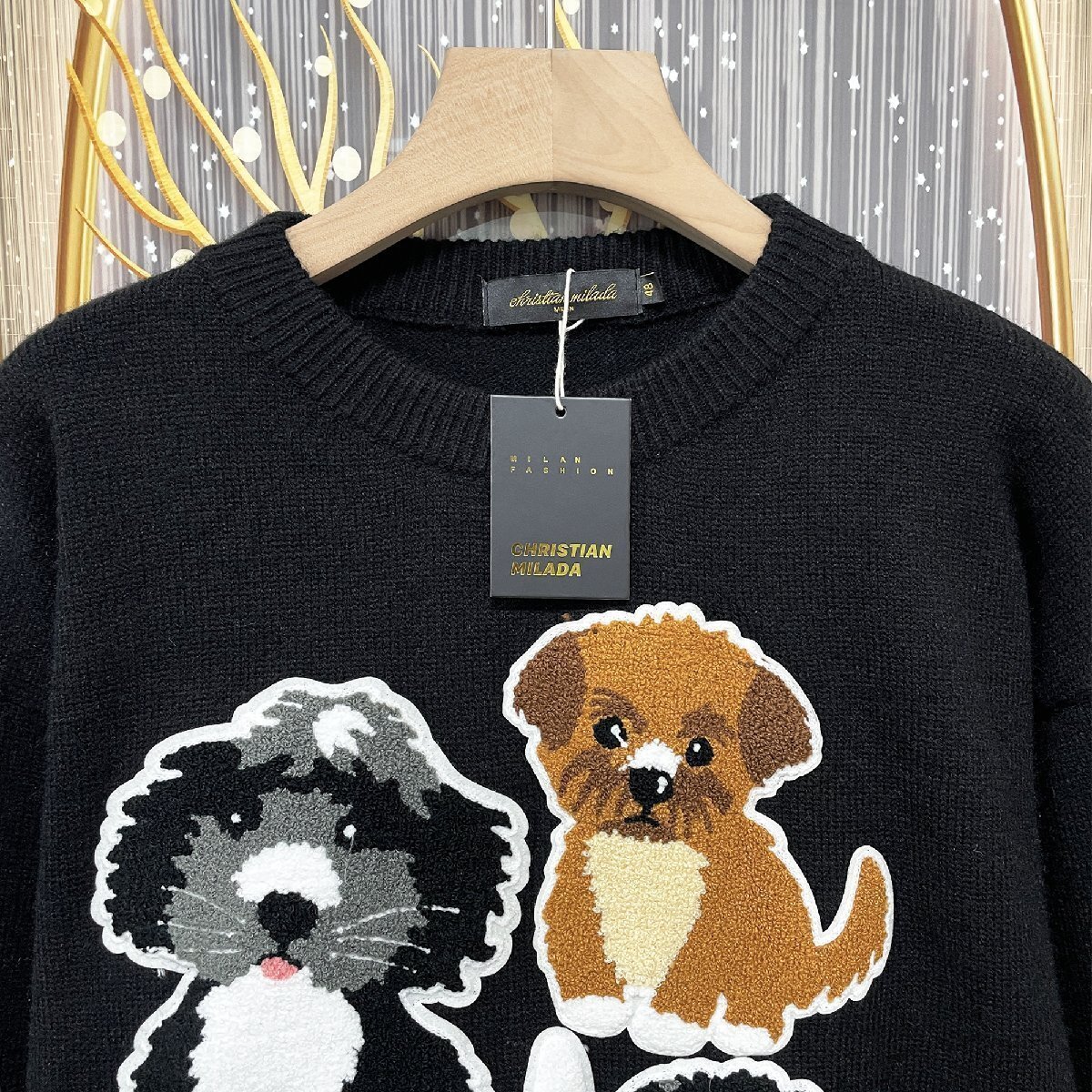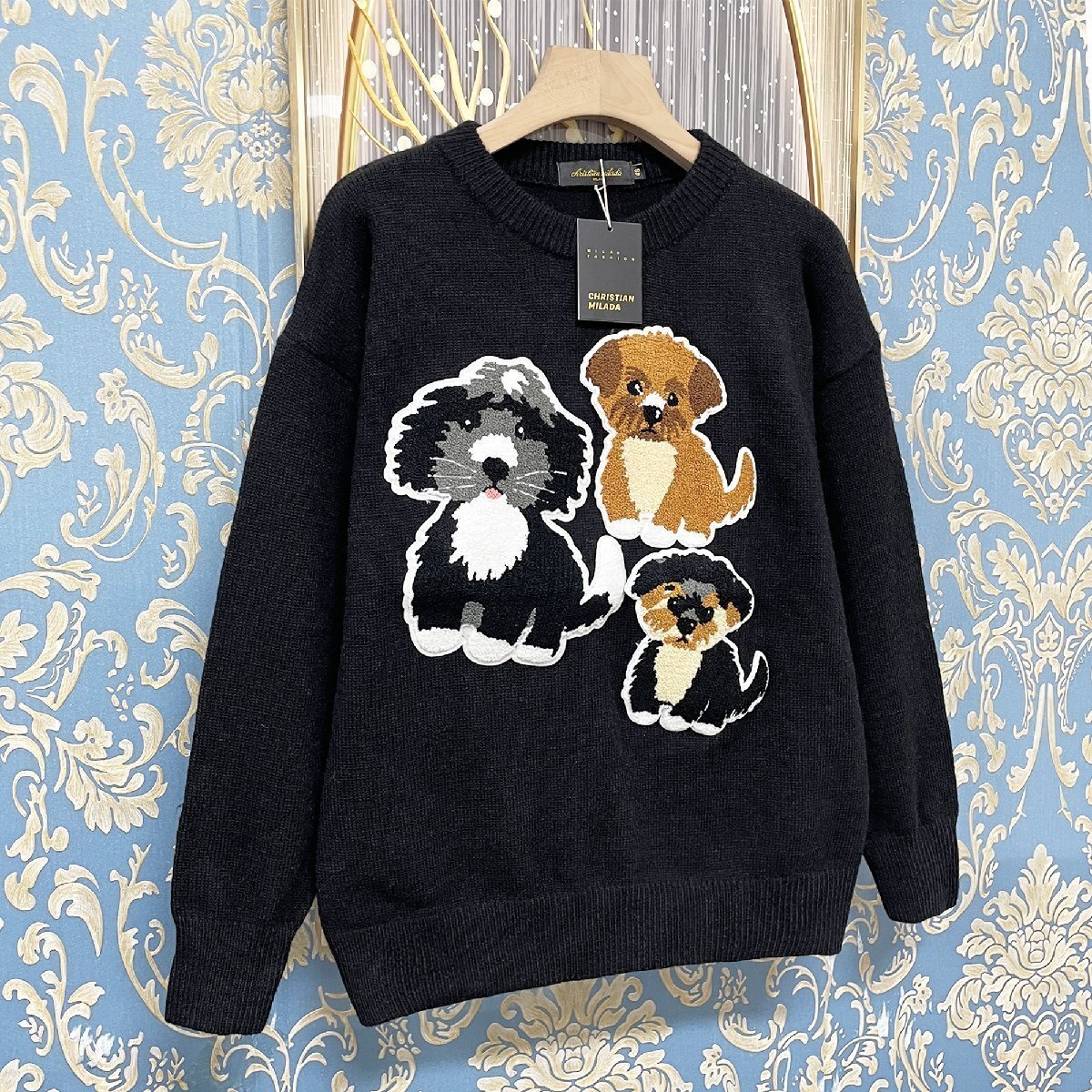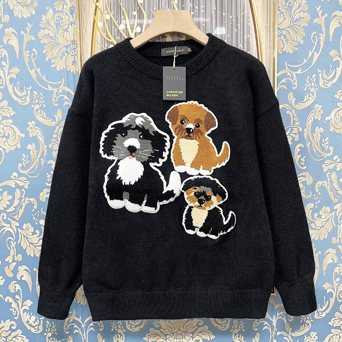 定価5万★christian milada・ミラノ発・セーター★ウール混 防寒 保温 ソフト 可愛い 犬柄 サガラ刺繍 レジャー ニット 通勤通学 XL/50