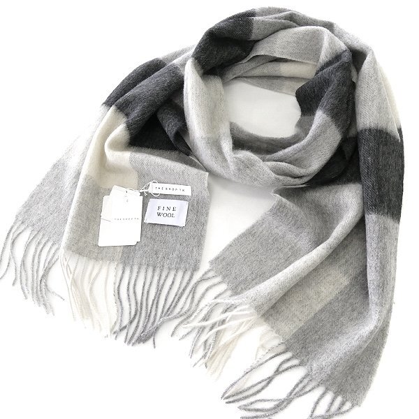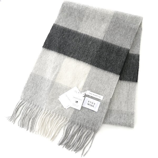 新品 未使用 紙タグあり 縦176cm(フリンジ部分含まず) 横30cm 羊毛100% グレー系×ブラック |