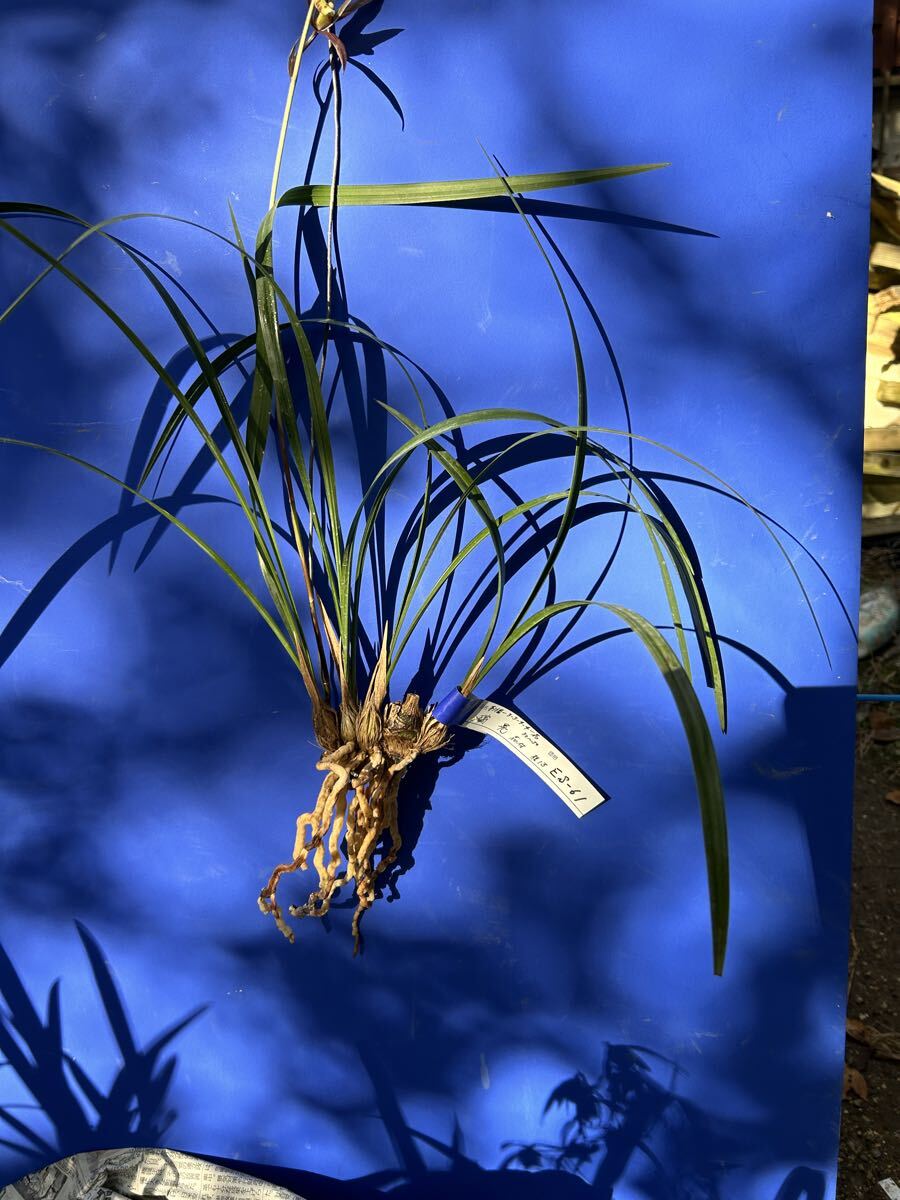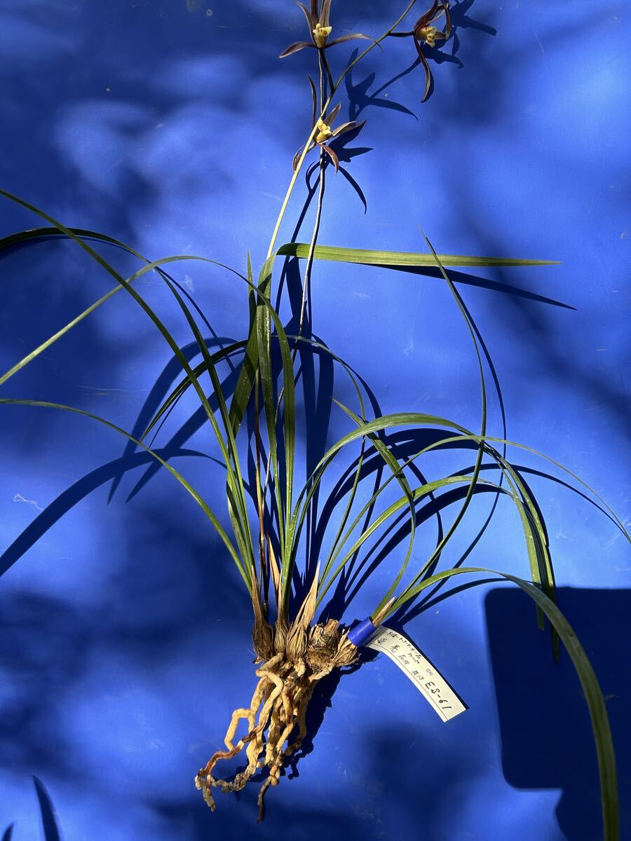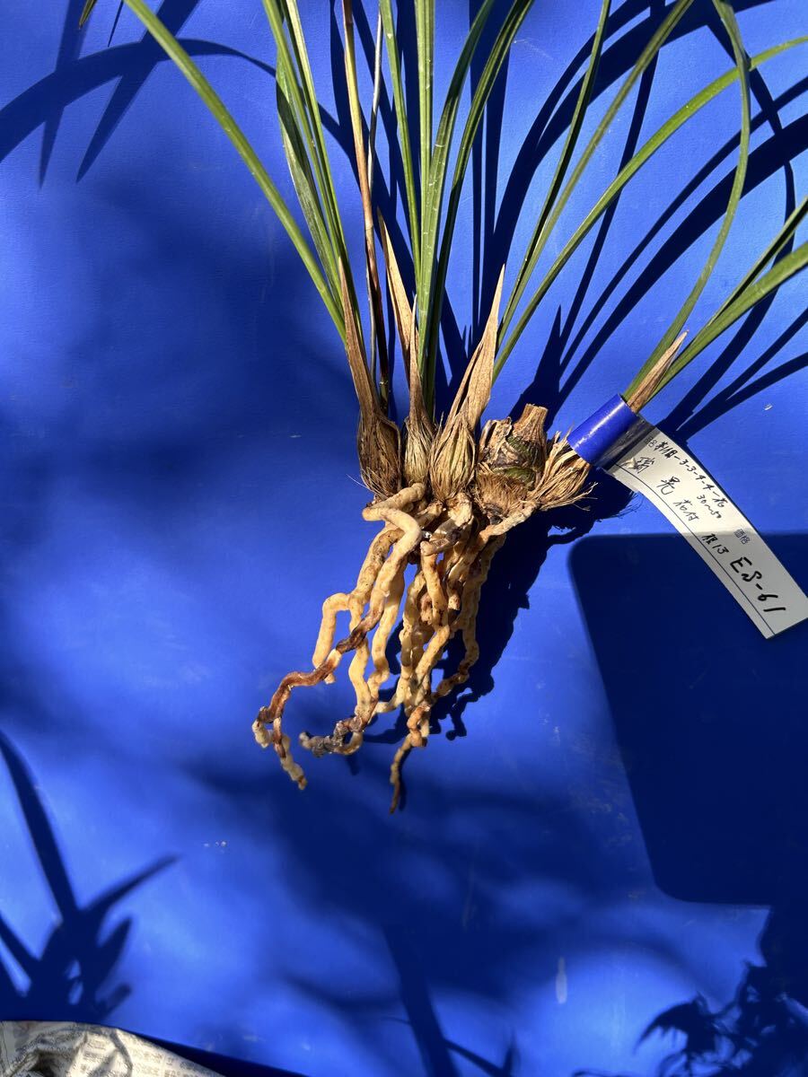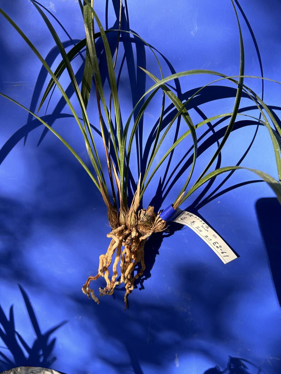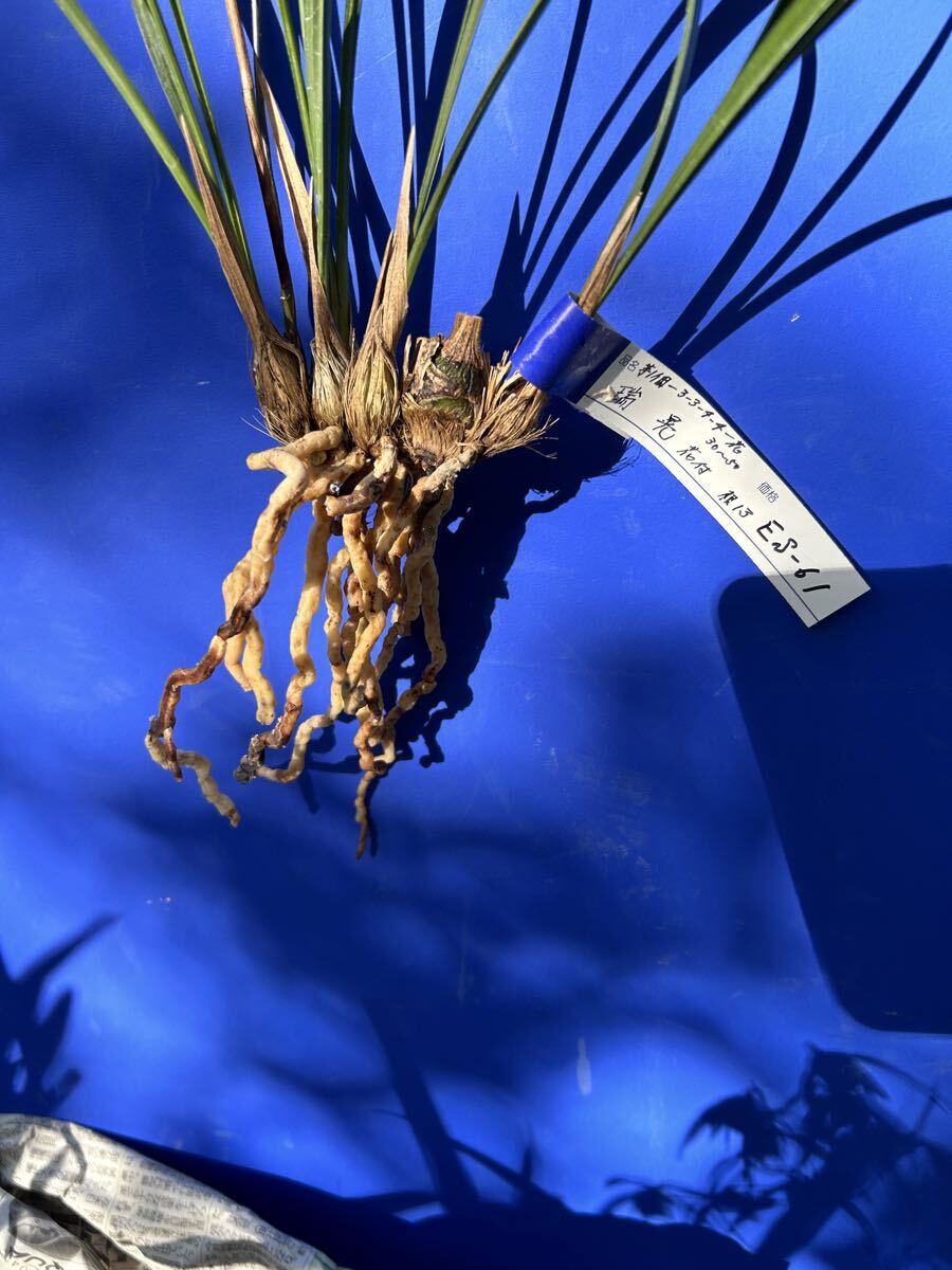 栽培増植品、日向寒蘭、登録品、瑞晃、花付き、E Sー61、は、宮崎県産の紅無点系の登録品で、有名品なので詳細は省きます。苗サイズは芋 I個に、 3 0〜5 0センチくらいの、 3ー 3ー 4ー 4の 4条立てで花付きです。根は13本です。水苔に包んで発送します。