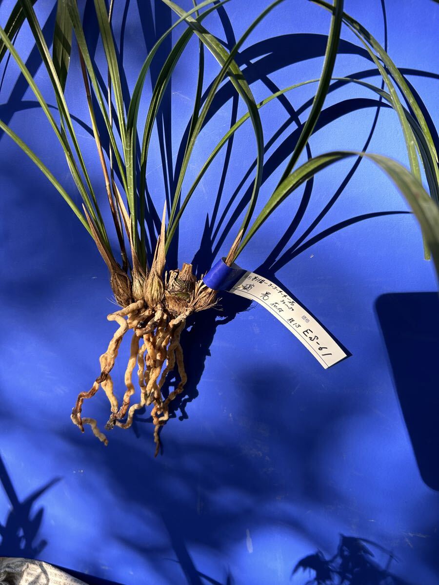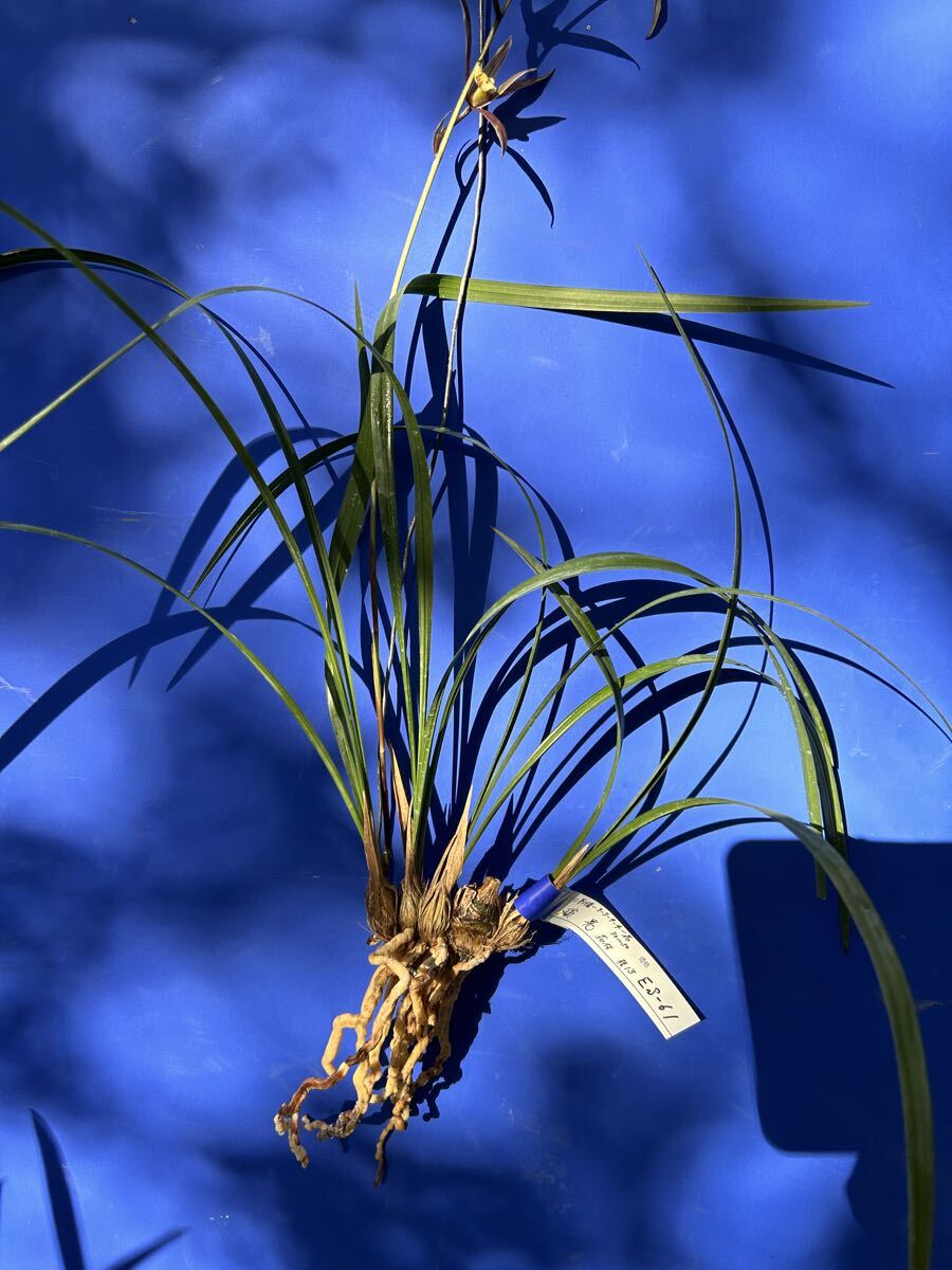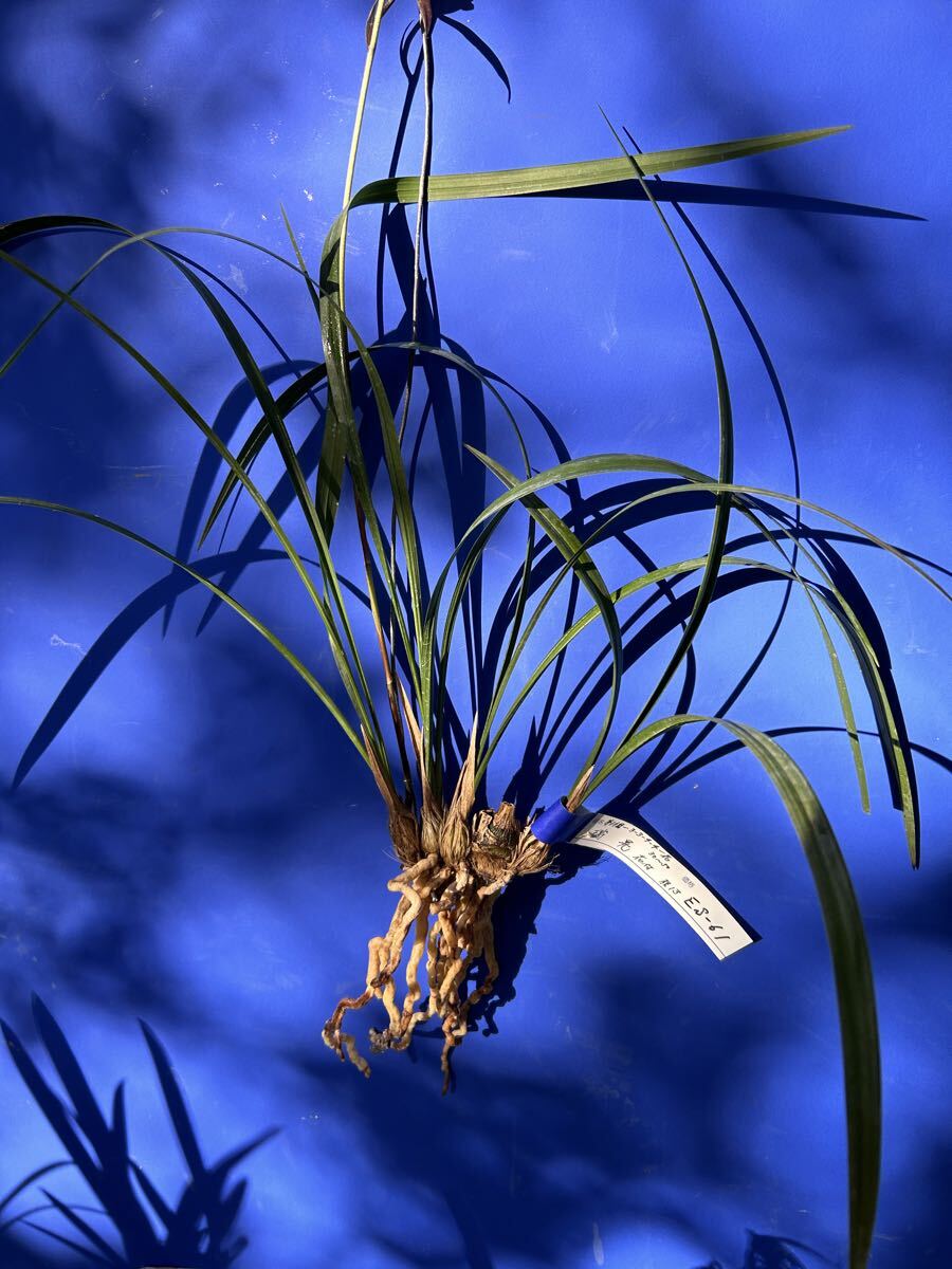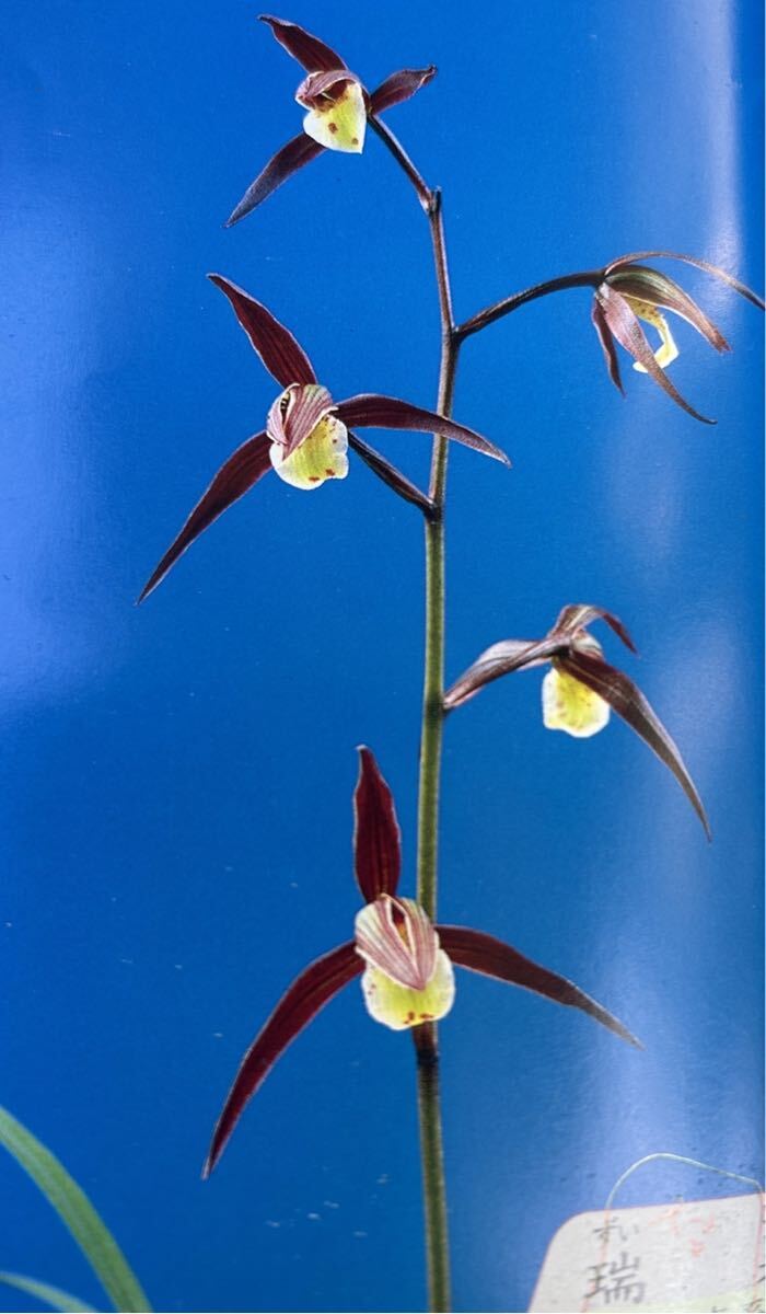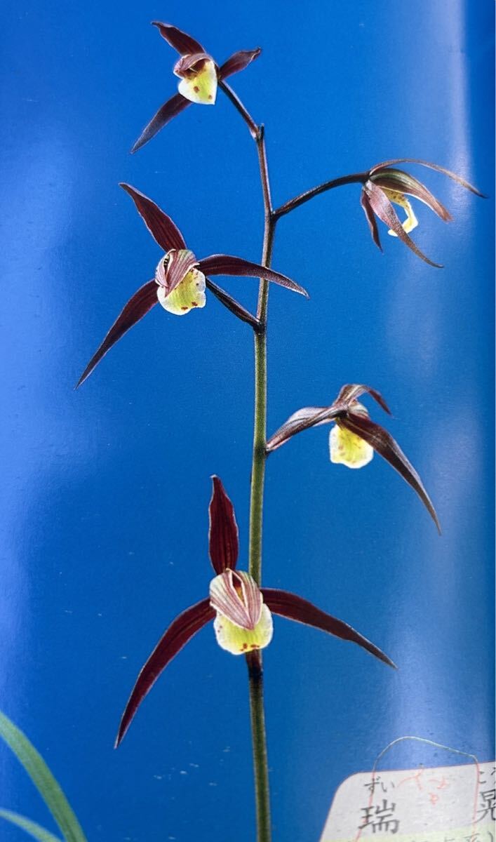 栽培増植品、日向寒蘭、登録品、瑞晃、花付き、E Sー61、は、宮崎県産の紅無点系の登録品で、有名品なので詳細は省きます。苗サイズは芋 I個に、 3 0〜5 0センチくらいの、 3ー 3ー 4ー 4の 4条立てで花付きです。根は13本です。水苔に包んで発送します。