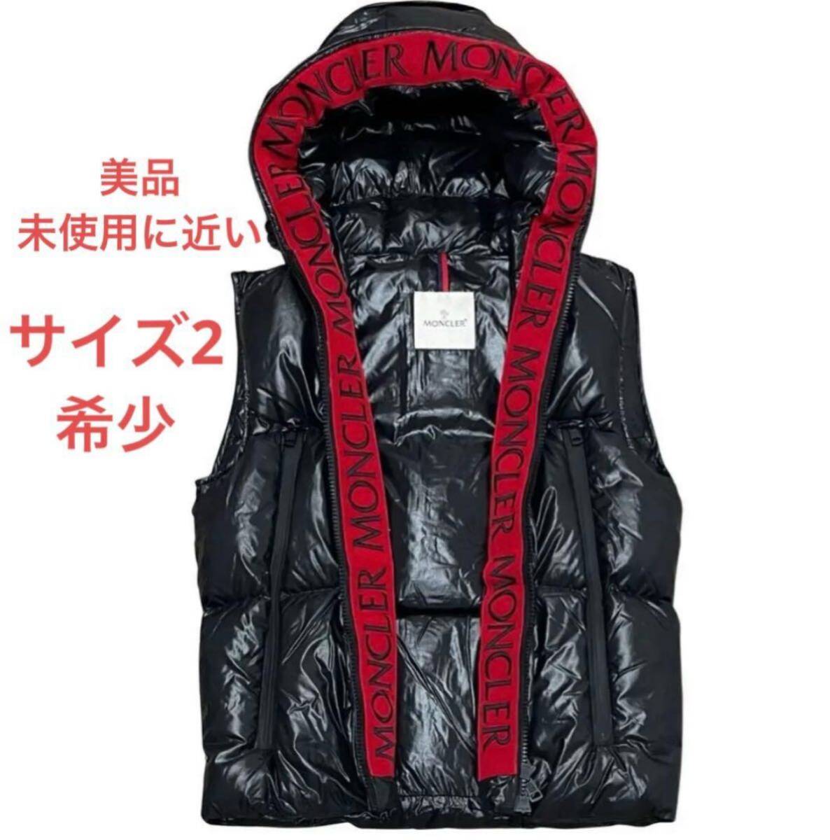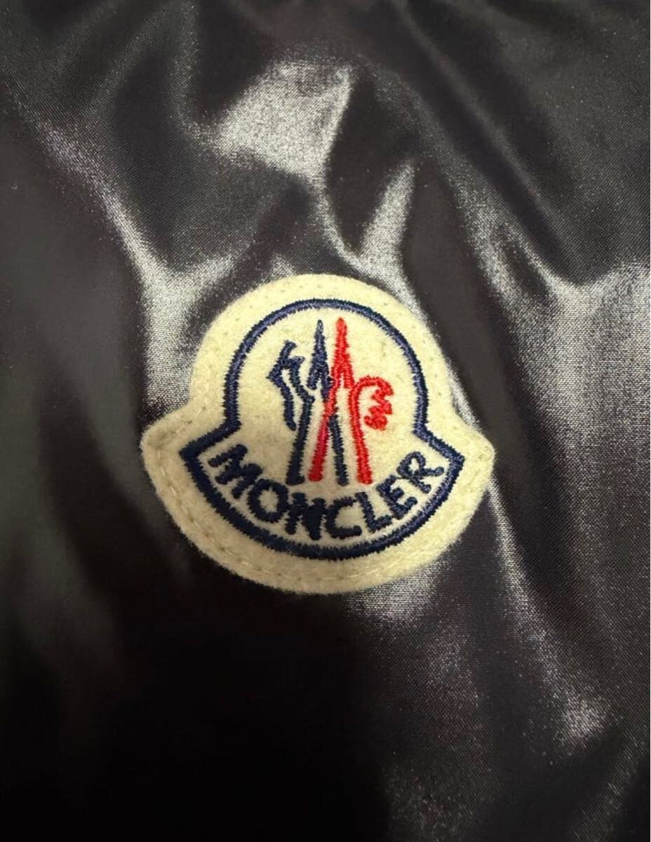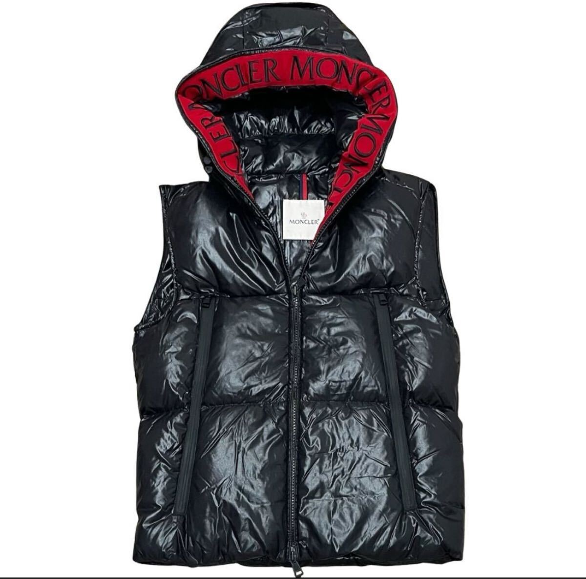 光沢のある黒のMONCLERダウンベスト、フード付きで刺繍ロゴが特徴。