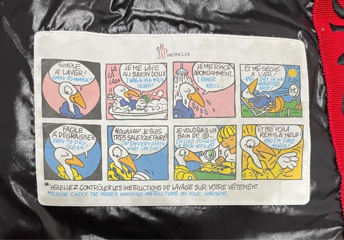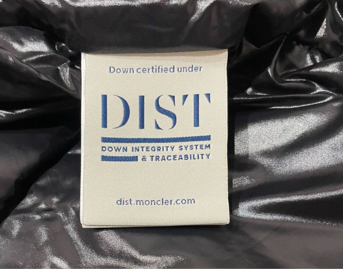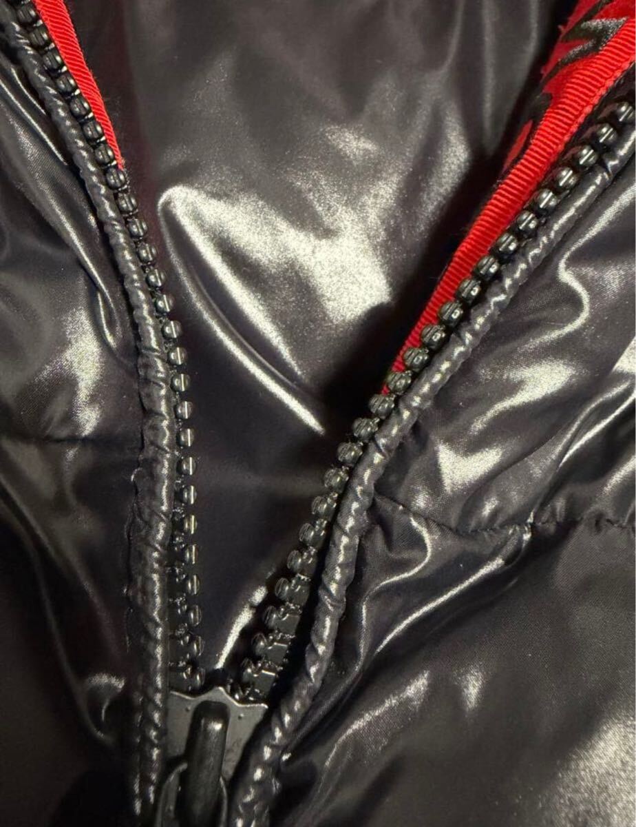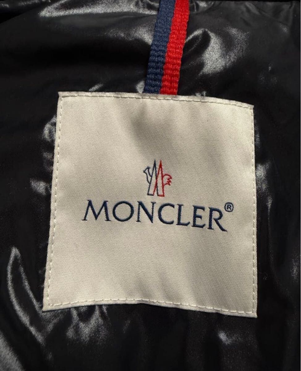 光沢のある黒のMONCLERダウンベスト、フード付きで刺繍ロゴが特徴。