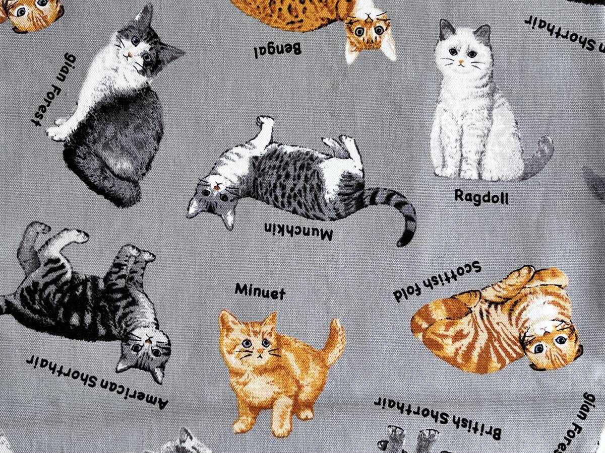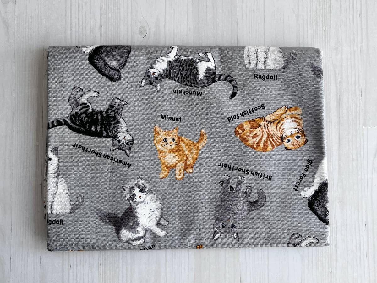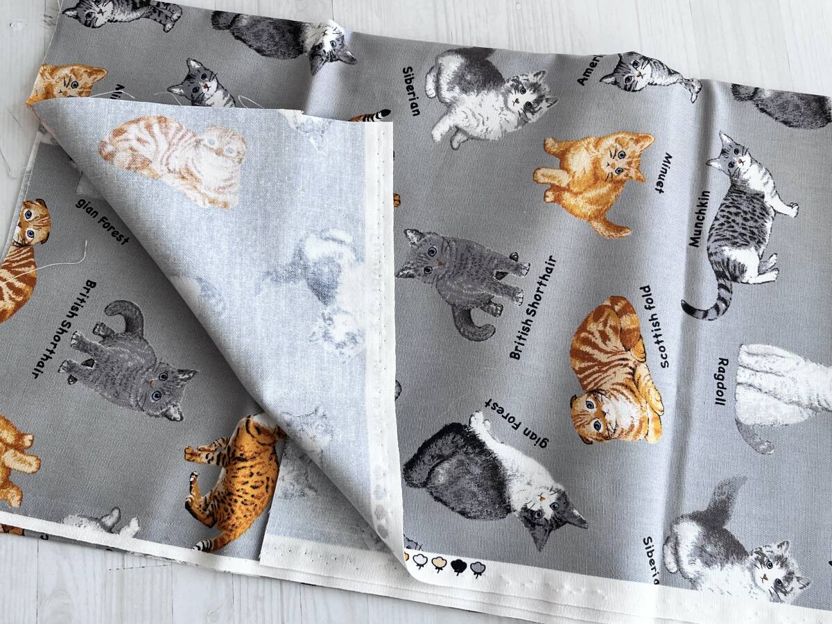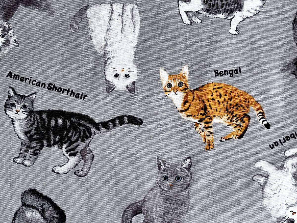 m国産コットン『ネコ』グレー地(オックス程度の厚さ)今では入手困難な生地になります。 サイズ…115cm×138cm+α 延長不可 ハギレですので、不定期なカットや、チャコペンのあと、接着芯が貼ってある部分が有ります。 ご理解の上、ご購入ください。