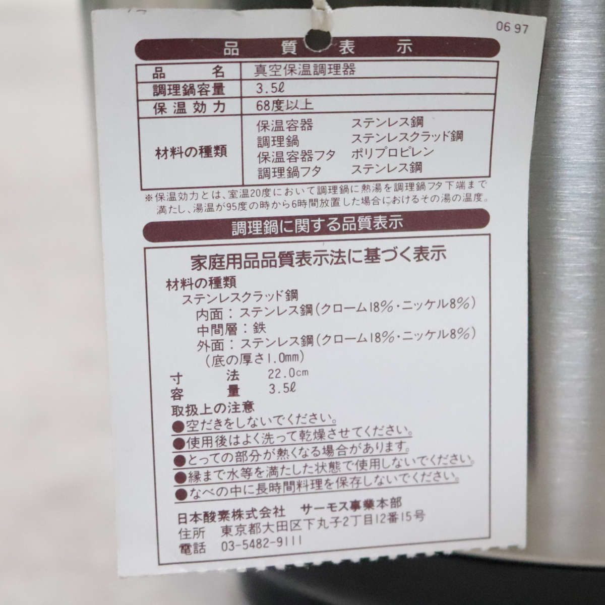 | 商品説明 | ★最後までお読みいただき、ご理解の上でのご入札をよろしくお願いいたします。 【FE003】 【美品】 THERMOS KPJ-3500 サーモス Shuttle Chef シャトルシェフ 真空保温調理器 3.5L 鍋 両手鍋 調理器具 キッチン用品 タグ付き 【動作状況】 こちらは、Cになります。 A:動作確認OK(全ての機能が問題なく使用できるか保証できません) B:通電のみ確認(動作確認は行っていない為ジャンク品の可能性含む) C:動作未確認品(ジャンク品の可能性含む) D:不動品、ジャンク品 ※動作未確認の商品は保証出来ません。 【商品状態】 開けて中を確認したら袋に入ったままの状態でした。 鍋の中も確認しましたが使用した形跡がないがキズやシミがある為美品としています。 基本的に中古品の為、スレや傷・汚れなどございます。 多数商品がある場合、傷や汚れを写真に載せきれない可能性もございます。 あらかじめご理解・ご了承の上入札をお願いいたします。 また、細かくクリーニングしている訳ではありませんので 状態を極度に気にされる方、神経質な方は入札をお控えください。 ■写真に写るもののみの販売となります。 写真にないものは付属いたしません。 画像をご確認の上、商品の状態に納得して頂いた方のみ入札をお願いいたします。 【取引ナビの対応日時】 ■平日9:00-17:00となります。※土日祝日は休業 【発送方法】 発送は佐川急便よりお送りいたします。 原則ご入金後、発送まで3日~7日お時間を頂いております。落札商品の量によって発送までのお時間が前後してしまう可能性があります。商品をお急ぎの方はご注意ください。 ※発送元地域が異なる商品の同梱はできません。 また土日祝日はヤフオクの取引全般をお休みしておりますので発送/連絡はできません。いつ頃発送するのか等の催促はおやめください。 ※沖縄・離島の方は【中継料】が発生し送料が高額になります為、佐川着払いとなります。 ※中継料が発生した場合、追加で中継料分の不足送料を請求させて頂きます。必ずご自身のお住まいをご確認頂いてから入金をお願い致します。 【直接引き取り】 引き取り場所は東京都八王子市になります。 詳しいご案内場所は落札後、取引ナビにてご連絡いたします。 受付時間:平日10-17時 (12-13時を除く) 商品の保管期間は支払い後、1週間(7日間)とさせていただきます。 直接引き取りをご希望される場合は、以下の通りお手続きをお願いいたします。 お取引の際は、「単品取引」を選択してください。 送料の選択では、必ず「0円(無料)」をご指定ください。 【重要】 システムの都合上、複数ご購入の場合でも「まとめて取引」は選択されないようお願い申し上げます。 ご理解とご協力のほど、よろしくお願いいたします。 ■手順 ① 取引情報の入力 ② yahoo!かんたん決済で支払うをクリック ③ 配送方法を直接引き取り0円を選択し決済を行ってください。 ④ 取引メッセージに 直接引き取り希望と、希望日、希望時間帯をお知らせください。 後程、ご案内の通知をいたします。 【注意事項】 ■発送連絡と同時に評価も入れております。評価不要の方はご落札時にメッセージでお知らせください。 ■商品到着後、破損があった場合は配送業者へ一度ご連絡をお願い致します。 ■発送方法の変更はお受けできません、また送料に納得がいかないままの入札はご遠慮ください。 ■商品到着後7日以上経ってからの返品・返金は対応出来ません。品物が到着次第すぐに商品の状態をご確認ください。 ★他にも沢山の商品を出品しております。 ご興味のある方は、他の商品も是非ご覧下さい。