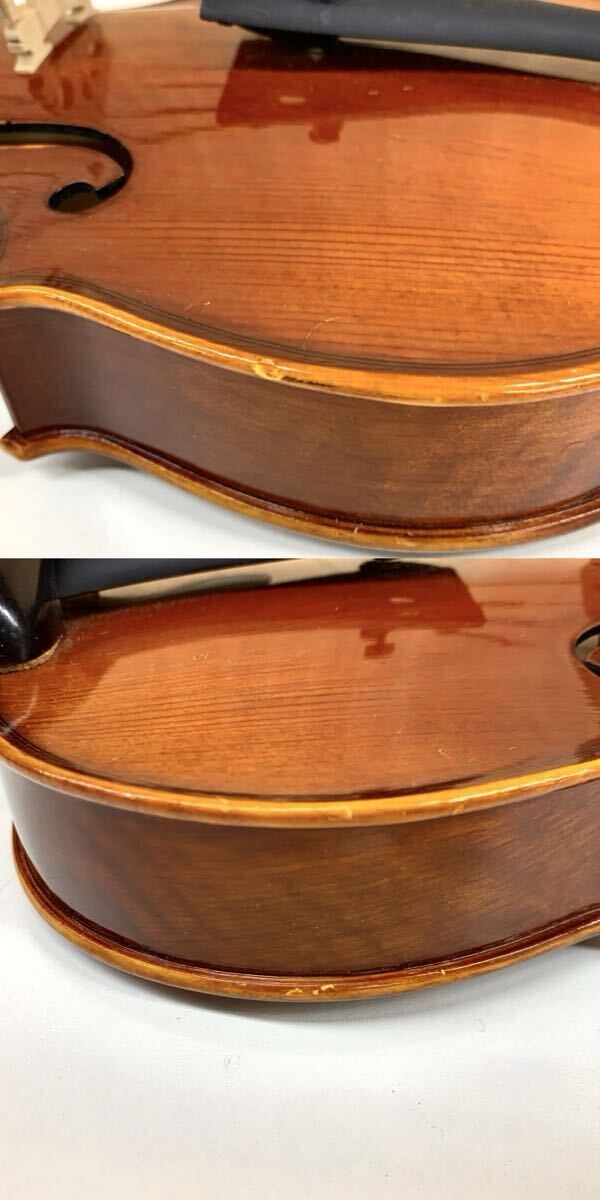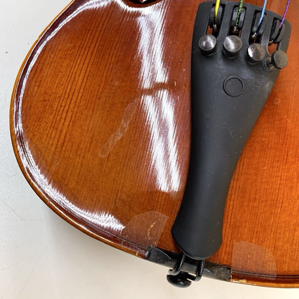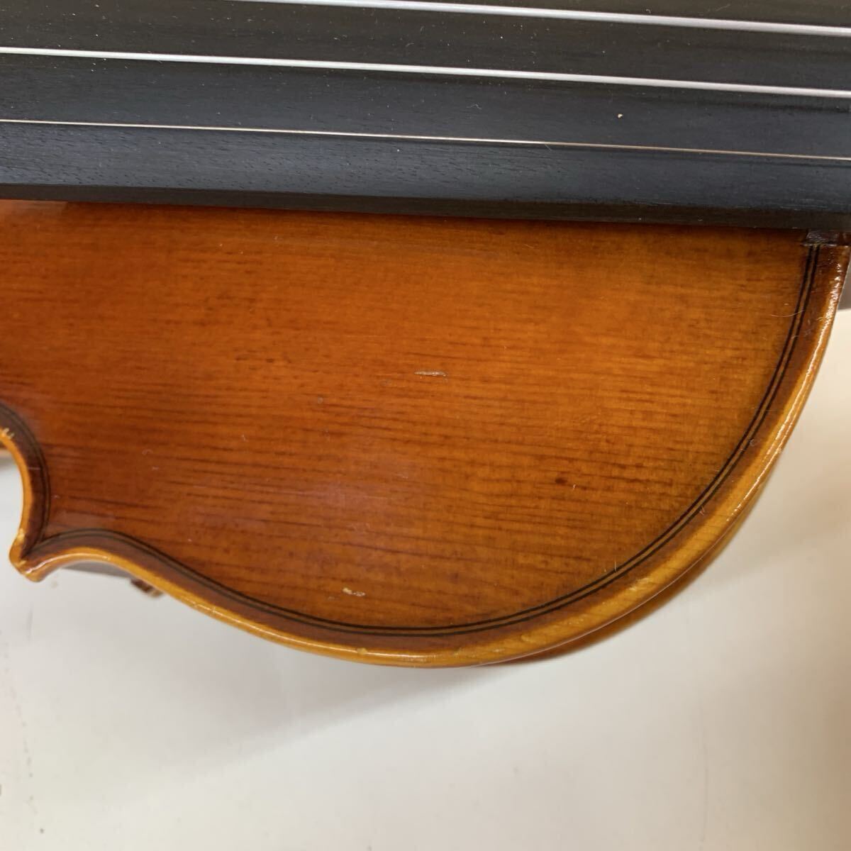 顎当てをつける部分は、トップには設置面の跡が、角には削れがございます。ボトム側には、顎当ての方のコルクが一部破れてくっついております。