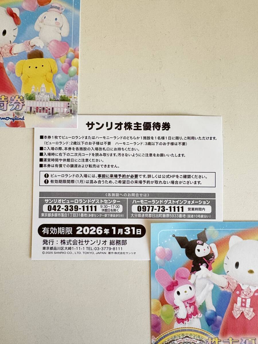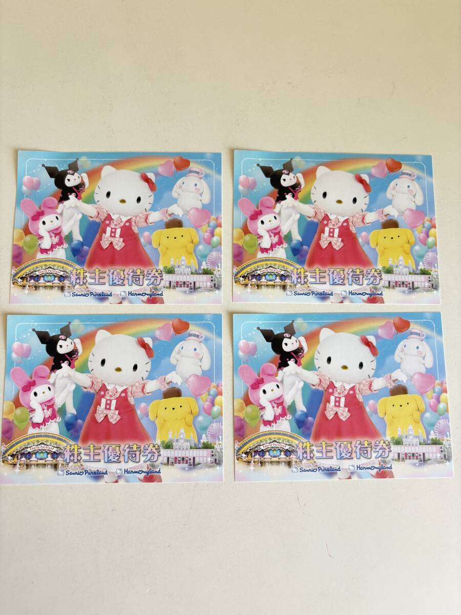 サンリオピューロランドまたはハーモニーランドのどちらかの施設を1名様1日に限り、通常営業時間内にお1人1回ご利用いただける株主優待券4枚になります。