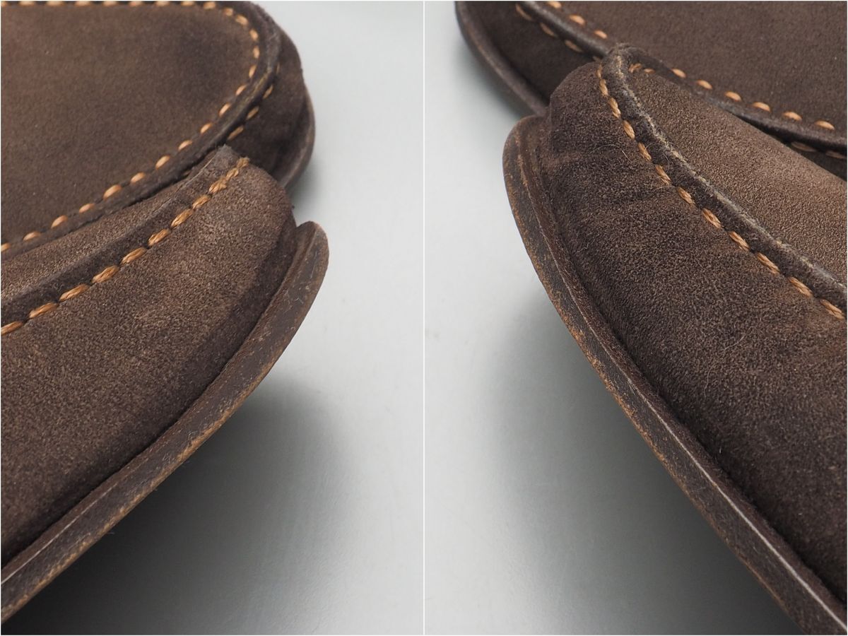 【コンディション詳細】 アッパーのシワや薄い擦れ、トゥ部分に線状の跡のようなものが見られ、ほかインソールやライニングの薄い汚れが見られますが、その他気になるようなダメージ等なくこれからも気持ちよくご愛用いただけます。 アウトソールの減りはトゥ・ヒール共に3mm程度です。 |