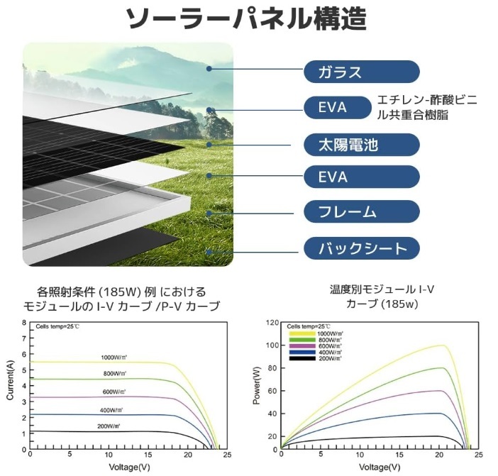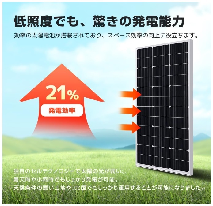 【太陽光発電による充電はバッテリー寿命を2倍3倍以上にできます。】 LVYUAN(リョクエン)100Wソーラーパネルは変換率21%の単結晶セルを採用、一日の発電量目安は400whになります。 12Vシステムはもちろん、パネルを直列または並列に接続することで24Vまたは48Vシステムにも使用できます。※バッテリーの残量、チャージコントローラーのタイプまたは日照条件等によって異なります。