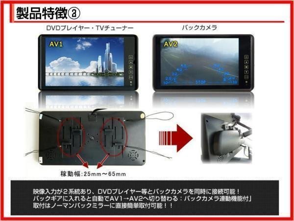 | 液晶サイズ:9インチ 画素数:480×234 消費電力:6W 映像入力端子:RCA2系統 映像入力切替機能:1系統のみバックギア連動可能 定格電圧:DC12V / DC24V 本体サイズ:横248mm × 高さ132mm × 奥行25mm |