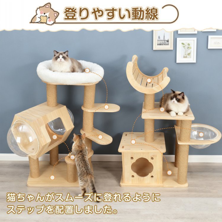 送料無料 キャットタワー 木製 天然 天然木 据え置き 低め 置き型 多頭飼い 宇宙船 クリアボウル 透明カプセル 見晴台 スリム 爪とぎ pt103