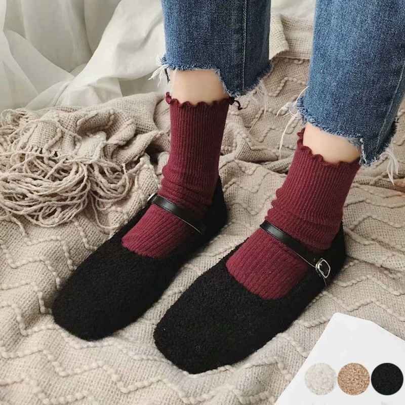 パンプス レディース ファーシューズ 韓国 秋冬 裏起毛 靴 ぺたんこ 25.0cm(40) ブラック