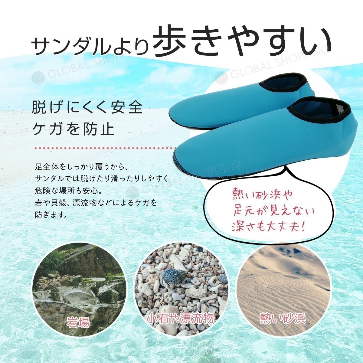 マリンシューズを履くことによって、岩場・磯・サンゴ礁帯のビーチ・砂浜など、