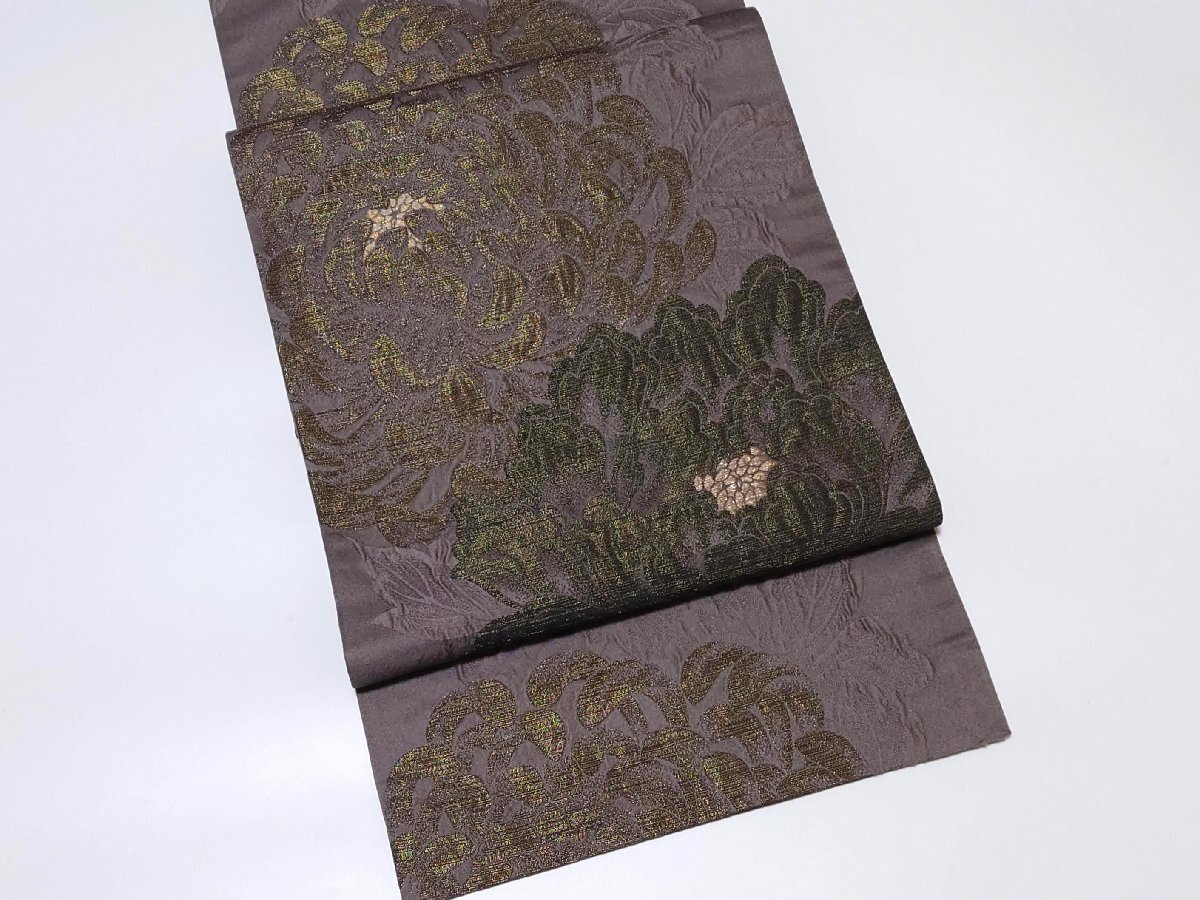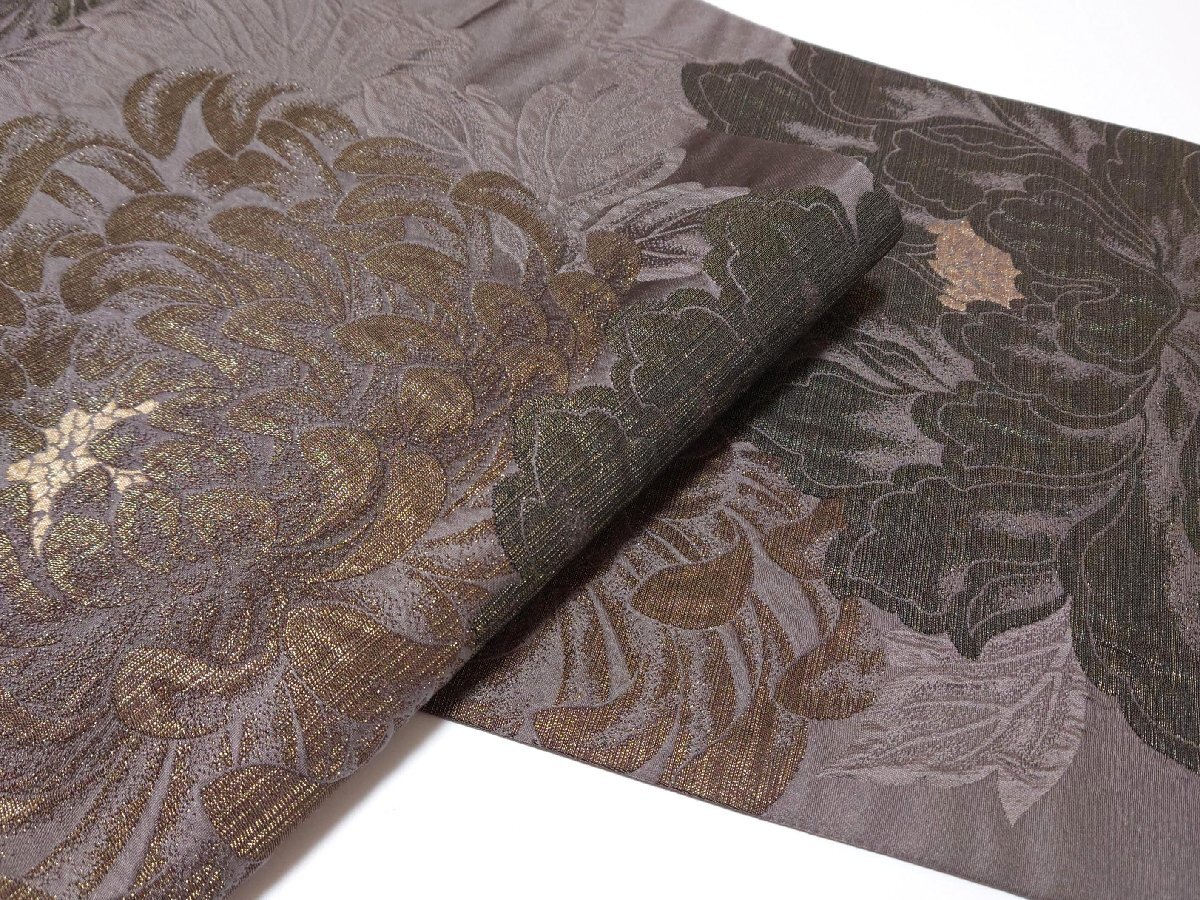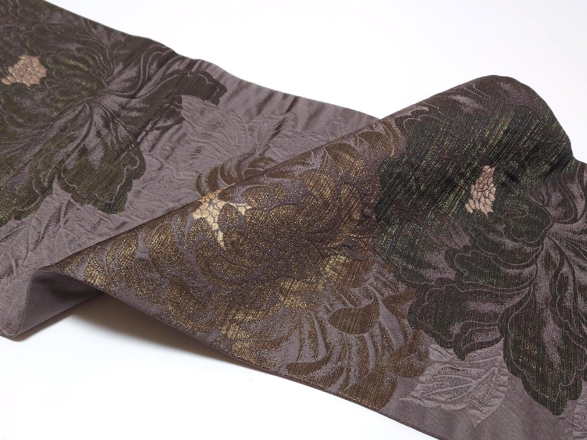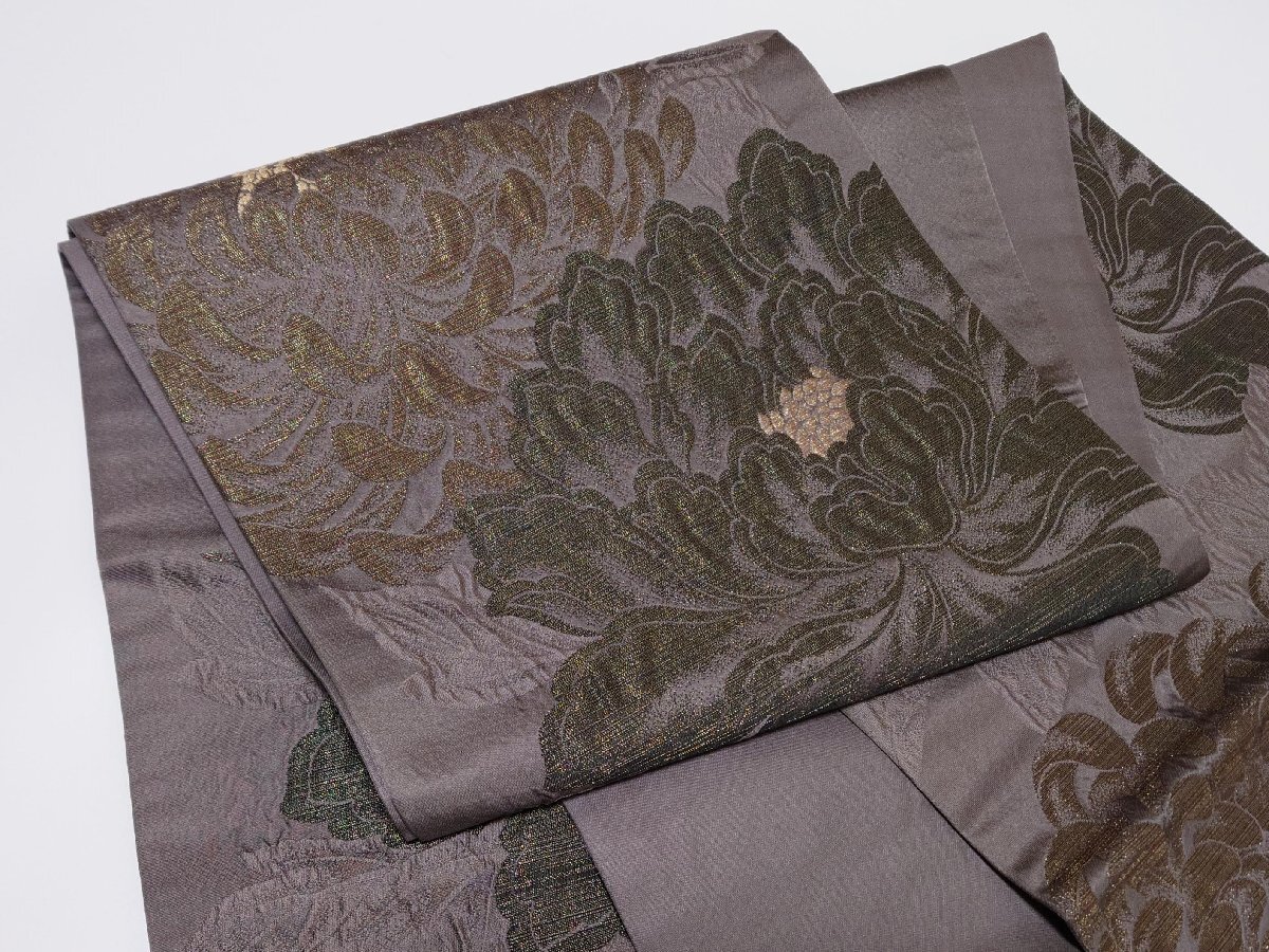 夢工房謹製、菊と牡丹の文様が織り出された袋帯のご紹介です。 落ち着きのある地に、繊細な織りと控えめな輝きが重なり、静かな存在感を放つ一本となっております。 菊と牡丹という古典的な花意匠を基調としながらも、 意匠の構成や織りの表情にはどこか洋風のニュアンスが感じられ、和洋の感性が美しく溶け合ったデザイン。 光の当たり方によって、文様の奥行きや立体感がやわらかく浮かび上がります。 華やかさを抑えたシックな雰囲気のため、訪問着や付下げはもちろん、 洒落感を意識したコーディネートにも取り入れやすく、装い全体を上品にまとめてくれます。 季節を問わず活躍し、帯合わせの幅が広い点も魅力です。 夢工房ならではの丁寧なものづくりが感じられる袋帯。 落ち着きと個性を併せ持つ花文様の帯をお探しの方に、ぜひおすすめしたいお品です。 ※撮影時部屋の照明によって画像の色に若干の差がございます。 色味に差がございますことをご了承のうえご検討下さいませ。 ※個人保管品のため記載のない僅かな難がある場合がございます。 そのような理由でのキャンセルはお受けできませんので、ご了承の上ご検討お願いいたします。 |