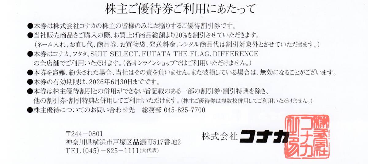 紳士服コナカ株主優待★20%OFF券★6/30まで