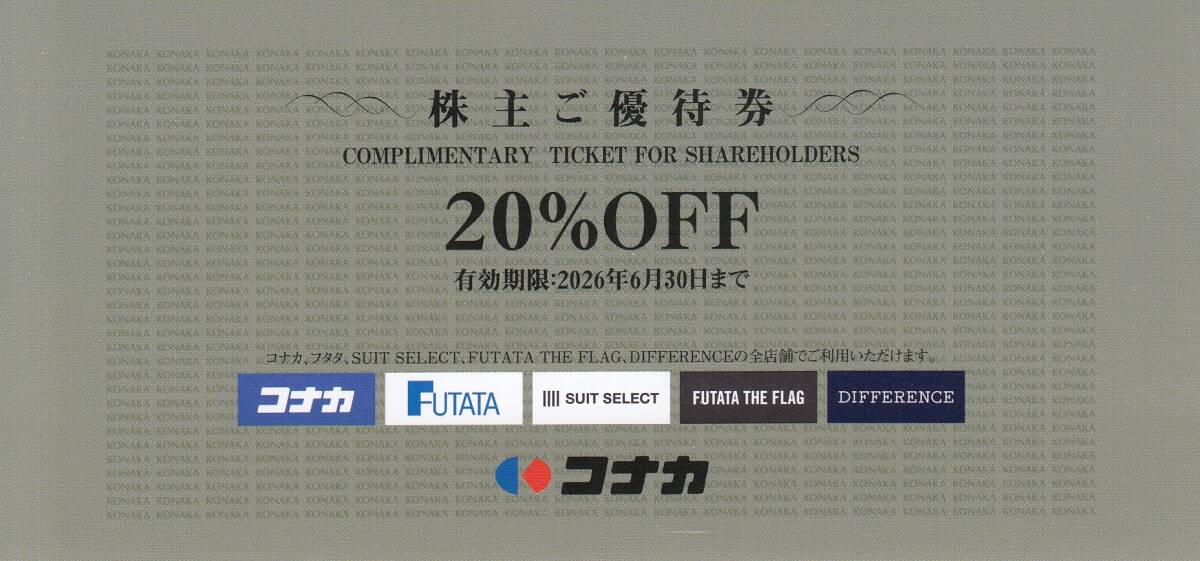 ・紳士服のコナカ、紳士服のフタタ、SUIT SELECT、FUTATA THE FLAG、DIFFERENCE等でのお買い上げ総額より20%引きになります。