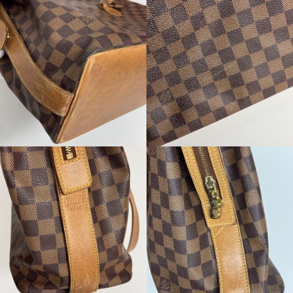 ・型崩れ、角や端にスレ、数か所汚れやスレによる模様の薄れあり。 ・開口部周りにひび割れあり。 ・ヌメ革には変色、黒ずみ、スレキズ、スレ傷みあり。 【ハンドル】 ・変色、くたびれ、スレあり。 【金具】 ・キズ、メッキ剥げあり。 【内側】 ・使用感、薄汚れ、インク汚れあり。 【ポケット】 ・インク汚れ、隙間汚れあり。 |