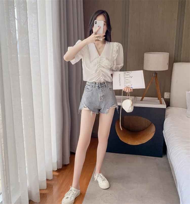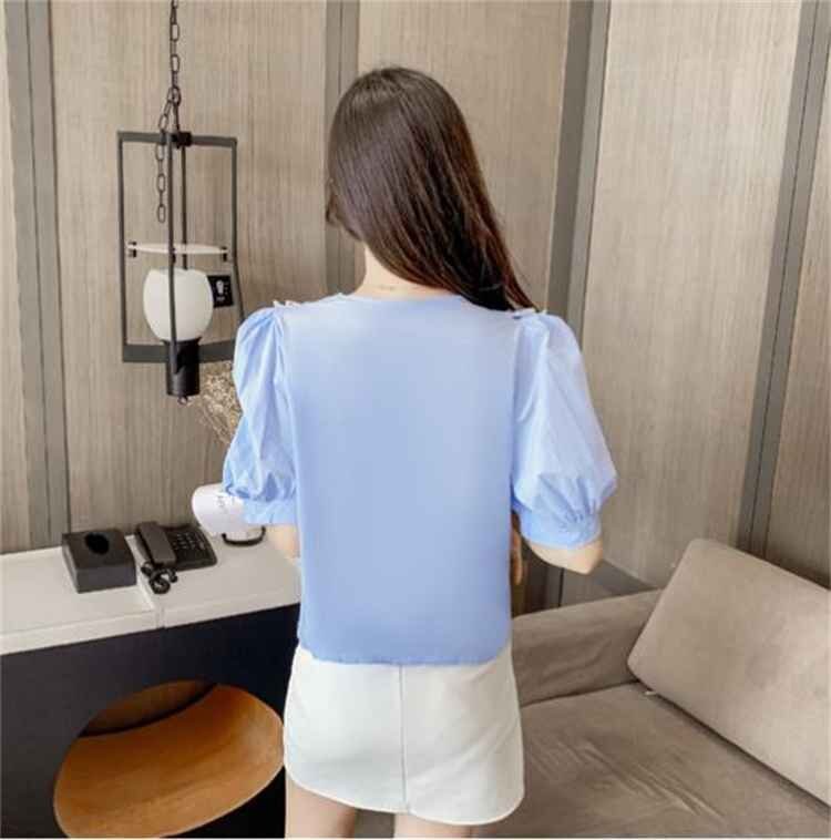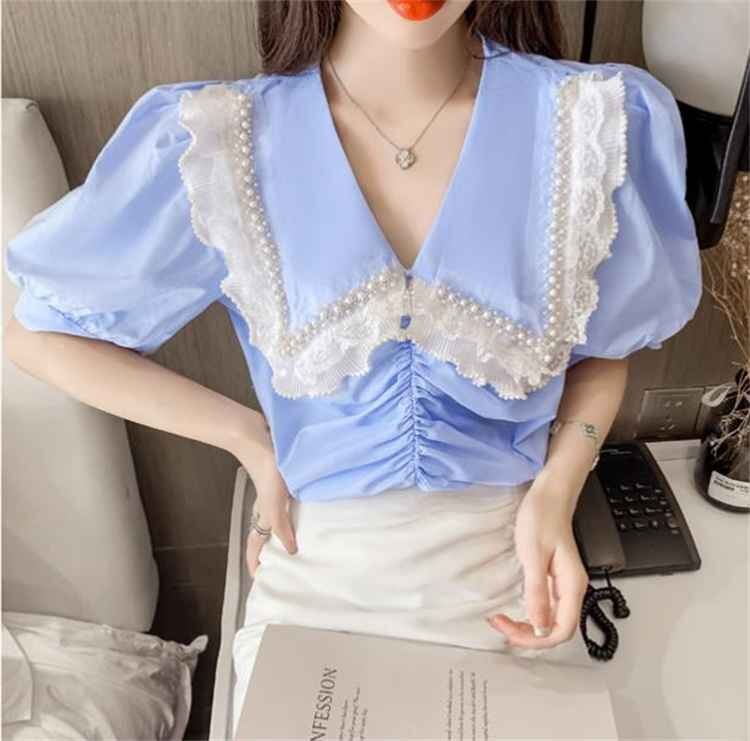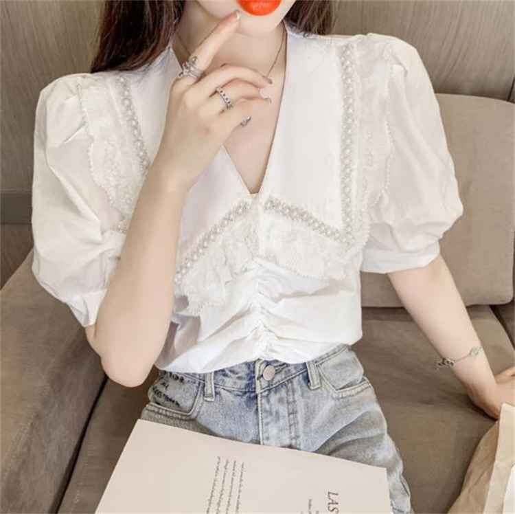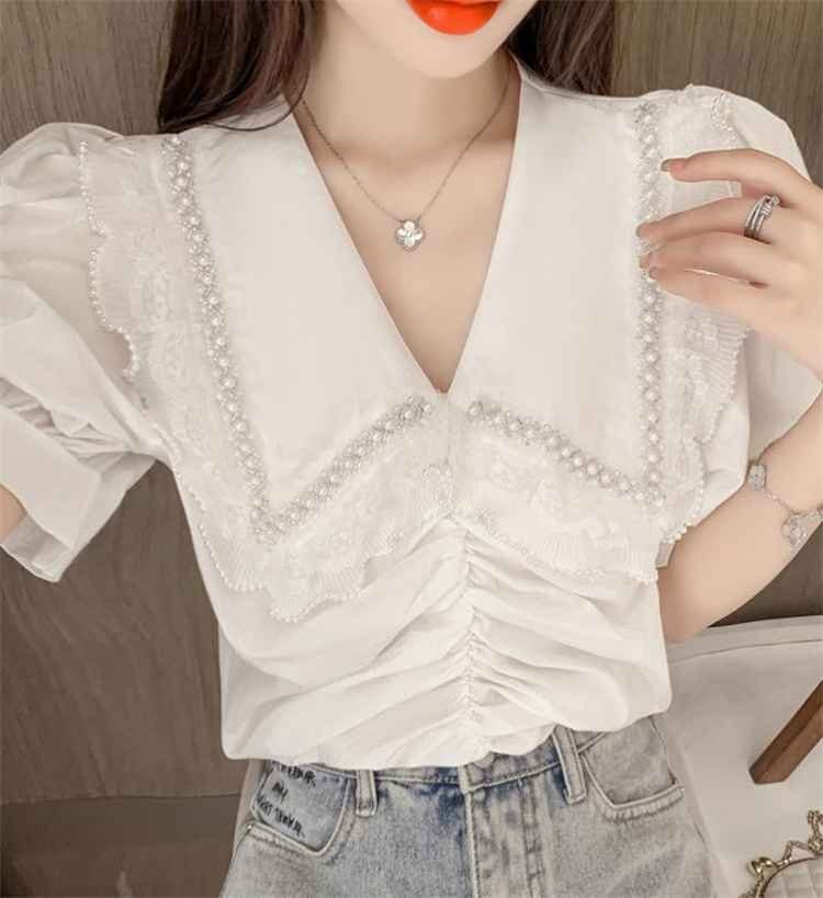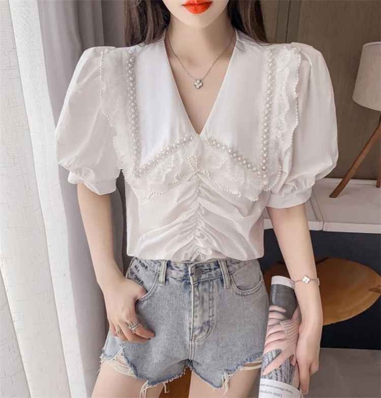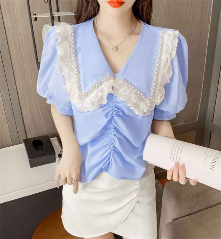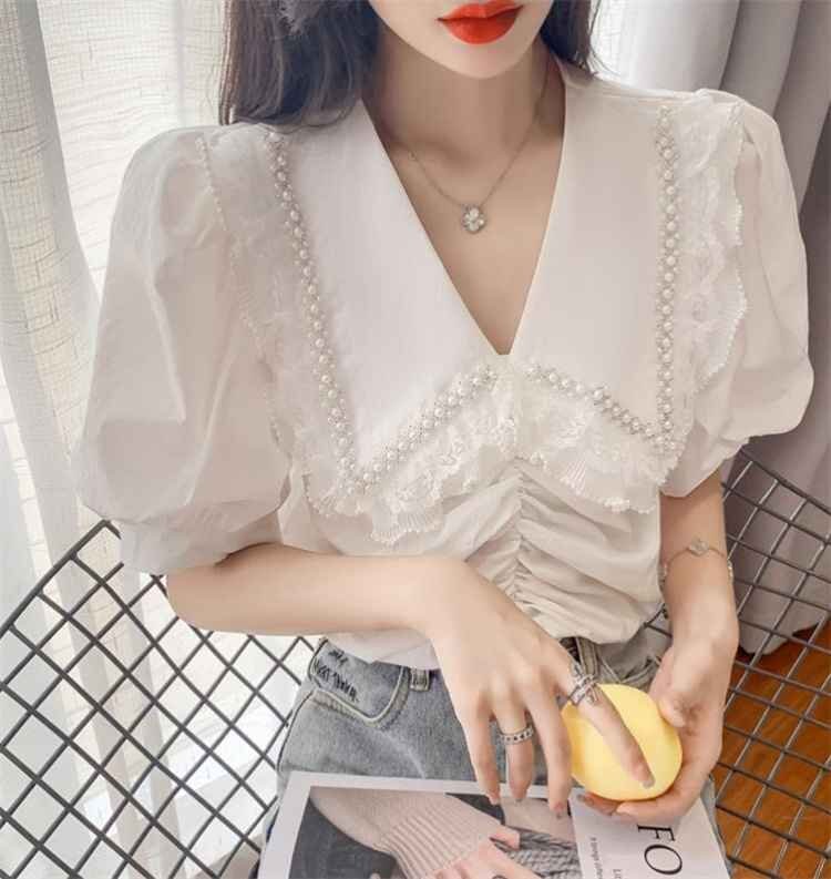 シフォンブラウス 襟付き レース トップス 半袖 かわいい系 XL ホワイト
