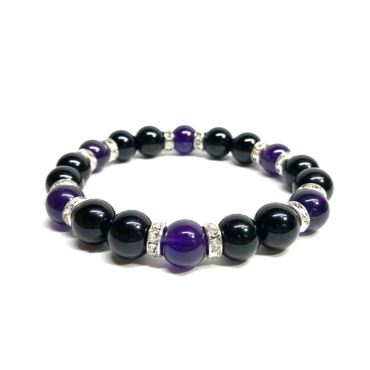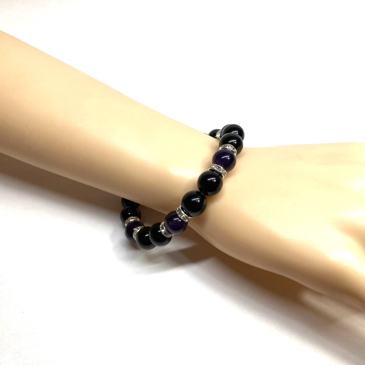 こちらは、モリオンとアメジストを組み合わせたパワーストーンブレスレットです。間にはロンデルを挟み高級感あるデザインに仕上げております。石大きさは腕にも馴染みやすいように10mm玉で内径約18cm(伸可能)です。(サイズ変更の場合は取引ナビにてご連絡をお願いします。) 数に限りがございますので気になる方はお早めにどうぞ。
