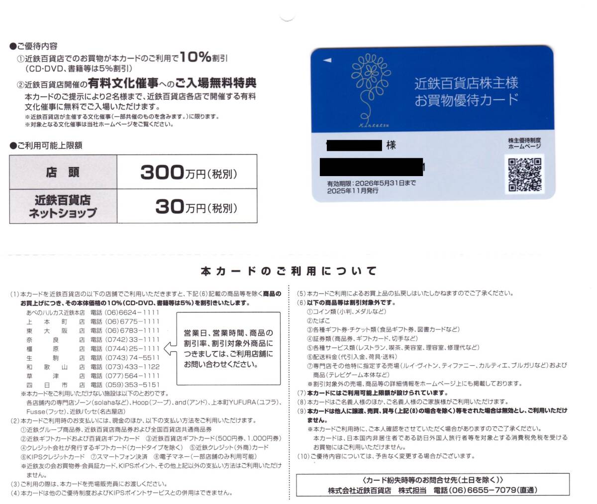 近鉄百貨店の株主優待である、お買い物優待カード(女性名義、利用上限300万円)1枚です。
