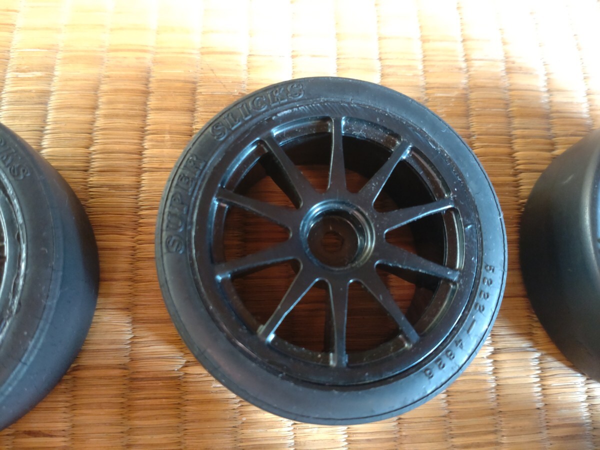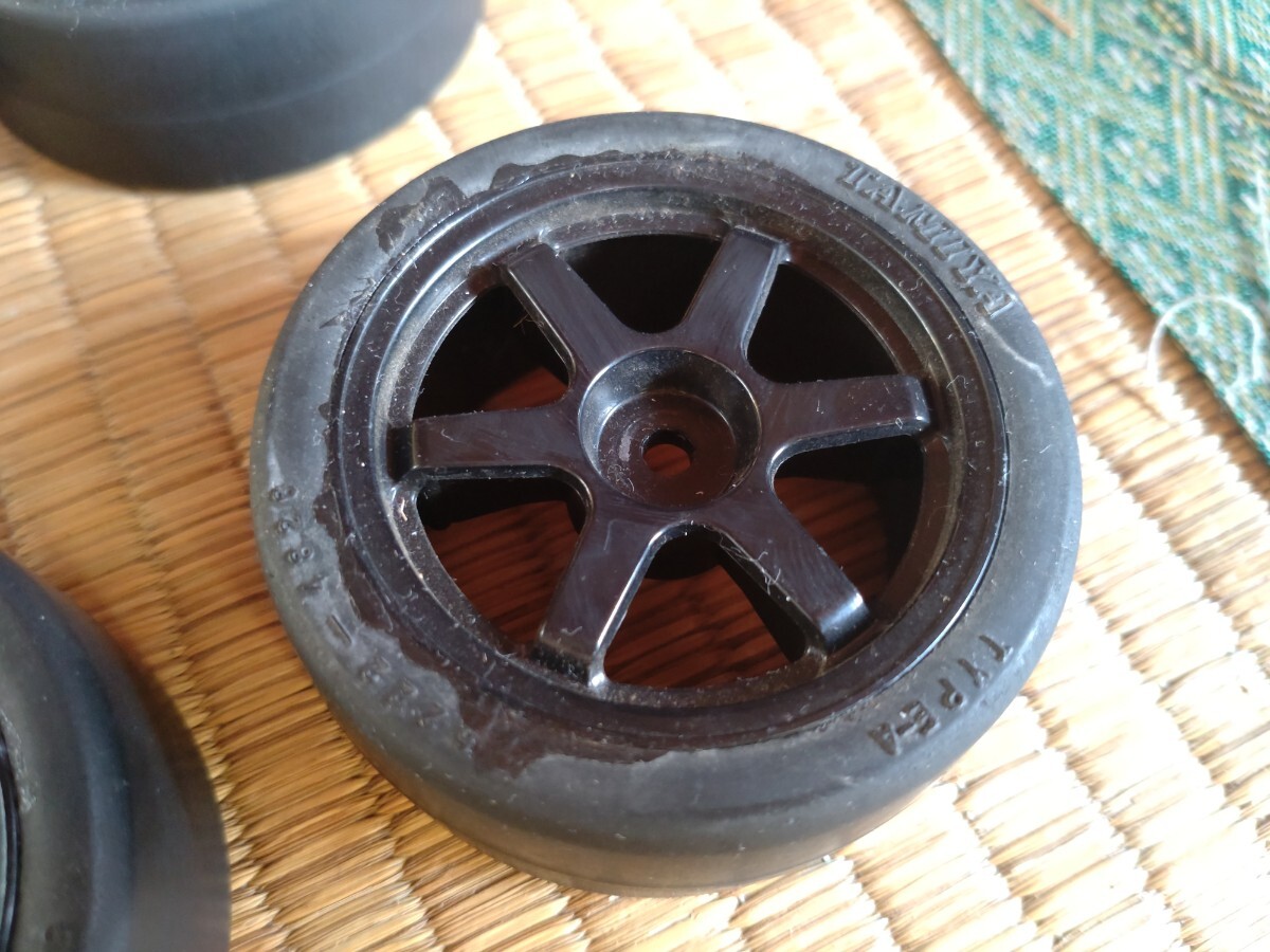 タミヤ純正オプションのスーパースリックタイヤ、ファイバーモールドタイヤタイプAが4本ずつです。