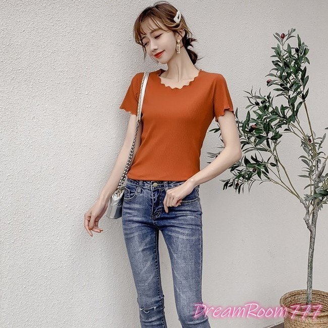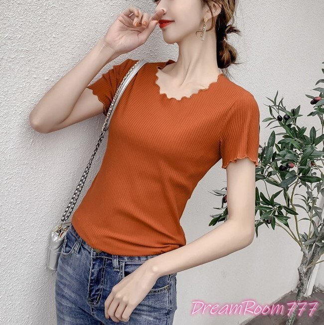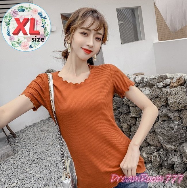 Solid color ラウンドフリル Tシャツ XLサイズ 美ライン 半袖 レディース オフィス カジュアル 無地 綺麗め K-088-6オレンジ