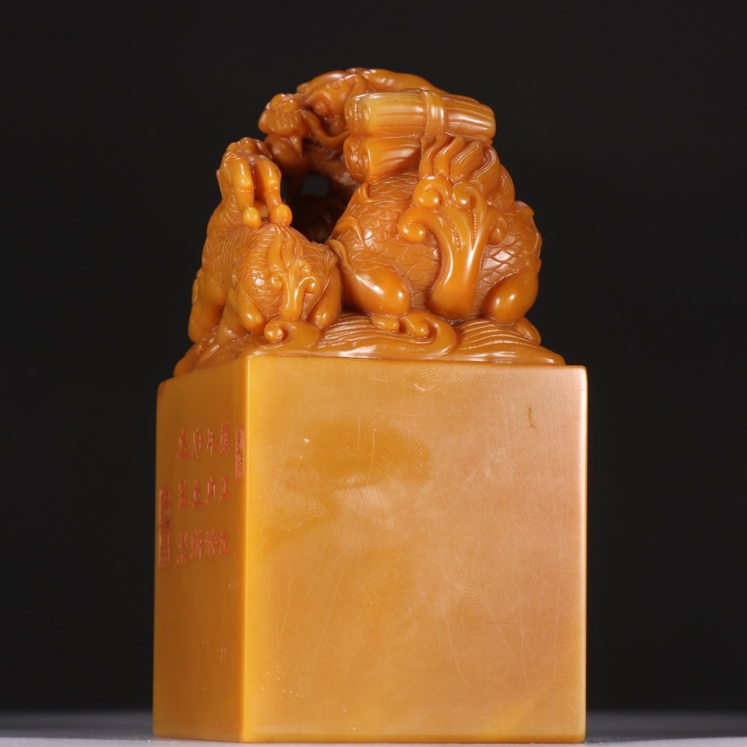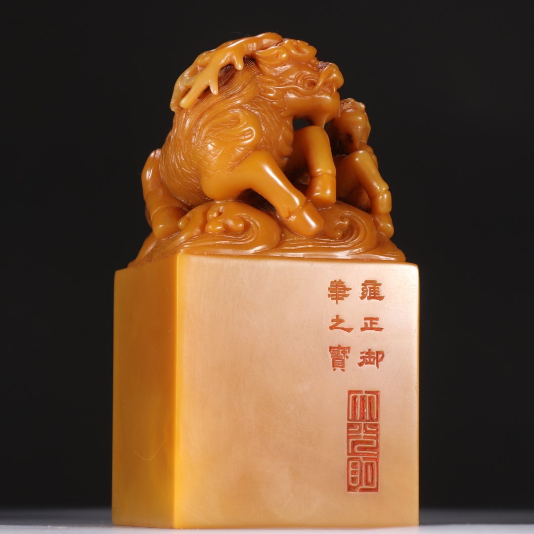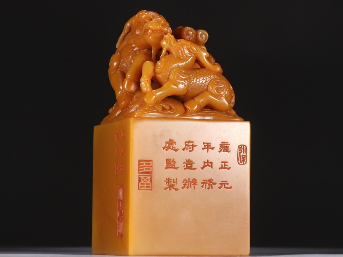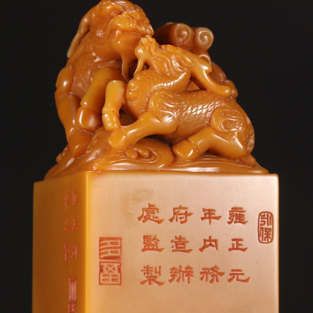 【安】清時代 雍正元年内務府造弁処監製 寿山田黄石彫 麒麟送書鈕御璽印章 印鑑 共箱 極細工 古置物 古擺件 中国古美術 時代物 330 サイズ(約寸) |