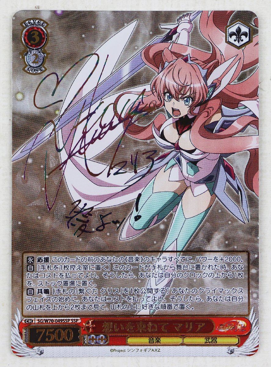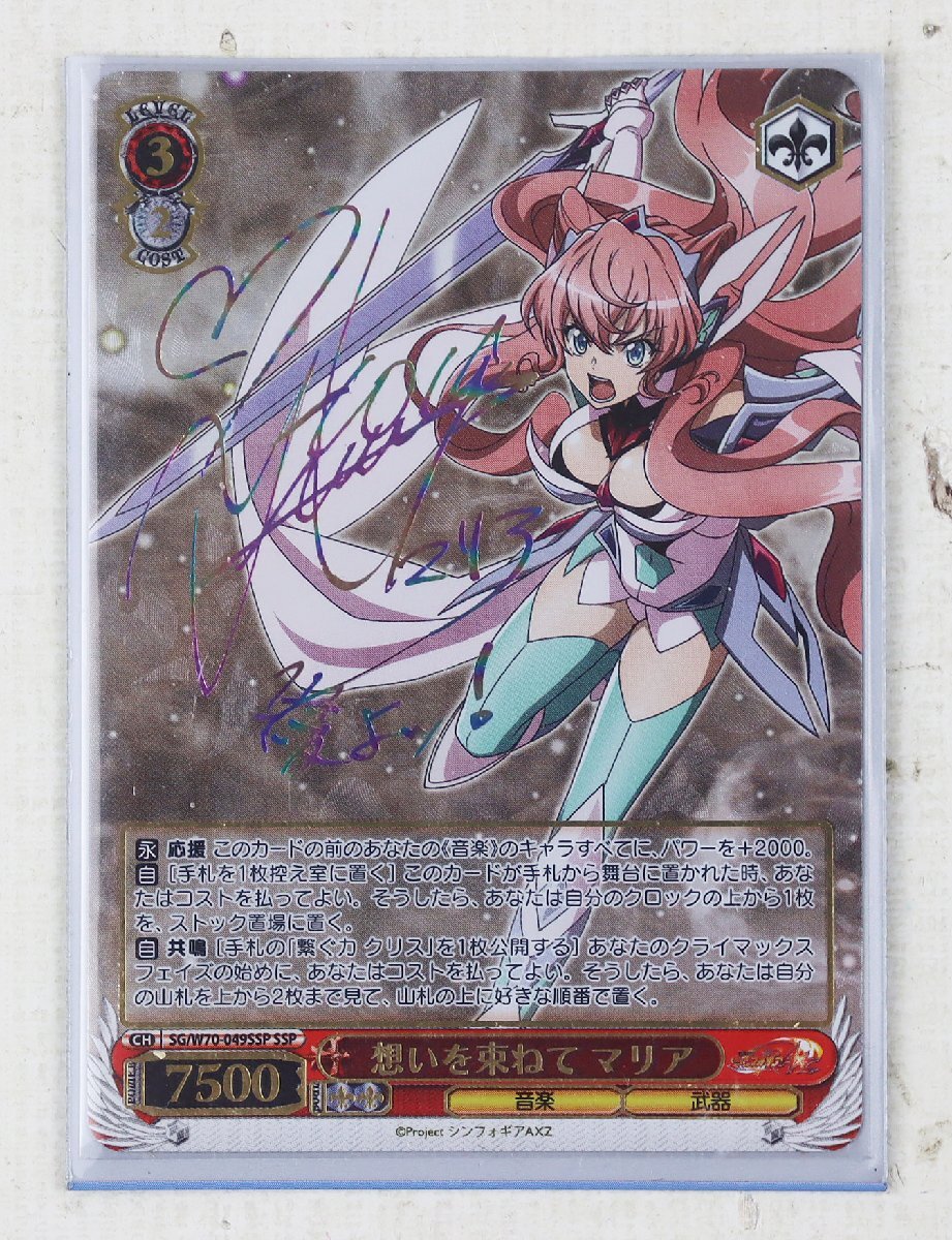 (3047189I) *中古品です。 カード ヴァイスシュヴァルツ 『想いを束ねて マリア SG/W70-049SSP』 ブシロード 箔押しサイン入り 戦姫絶唱シンフォギアAXZ *付属品 スリーブに入っています。 (透明/アズールレーンの二重) *外観 スリーブには細かなスレ・キズ・僅かにヨゴレ等があります。 カード本体には目立ったキズ・ヨゴレ等はありませんが、お取引後の問題を避けさせて頂くため、プレイ用としてお考えください。 ご理解頂いた上での入札をお願いします。 | ||||