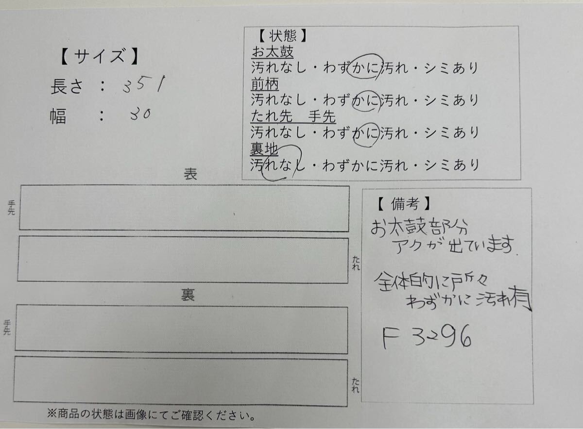 お太鼓に薄いアク、全体的に所々薄い汚れがあります。