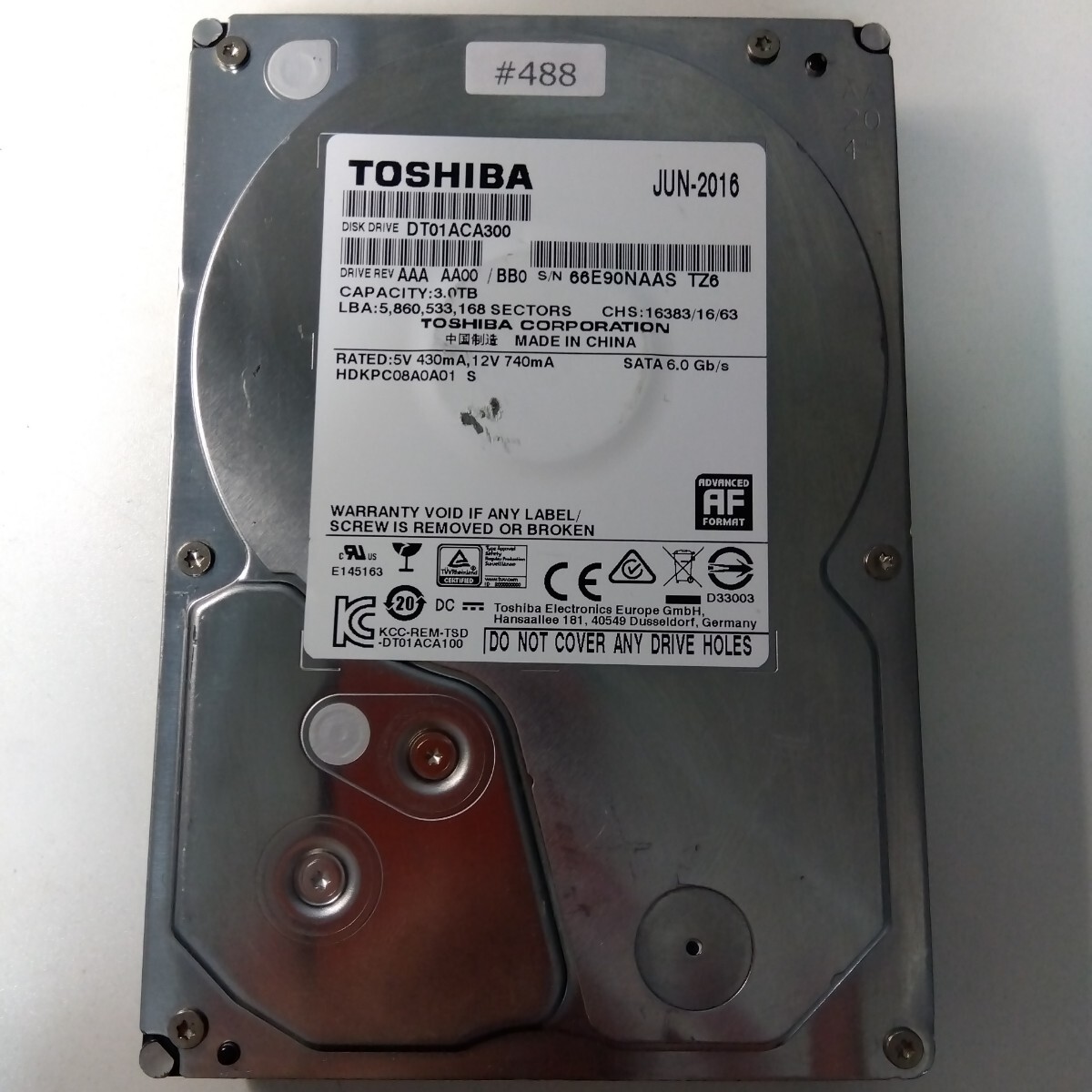 HDD 3TB 3.5インチハードディスク / Crystal DiskInfo 正常 / #488 / TOSHIBA DT01ACA300